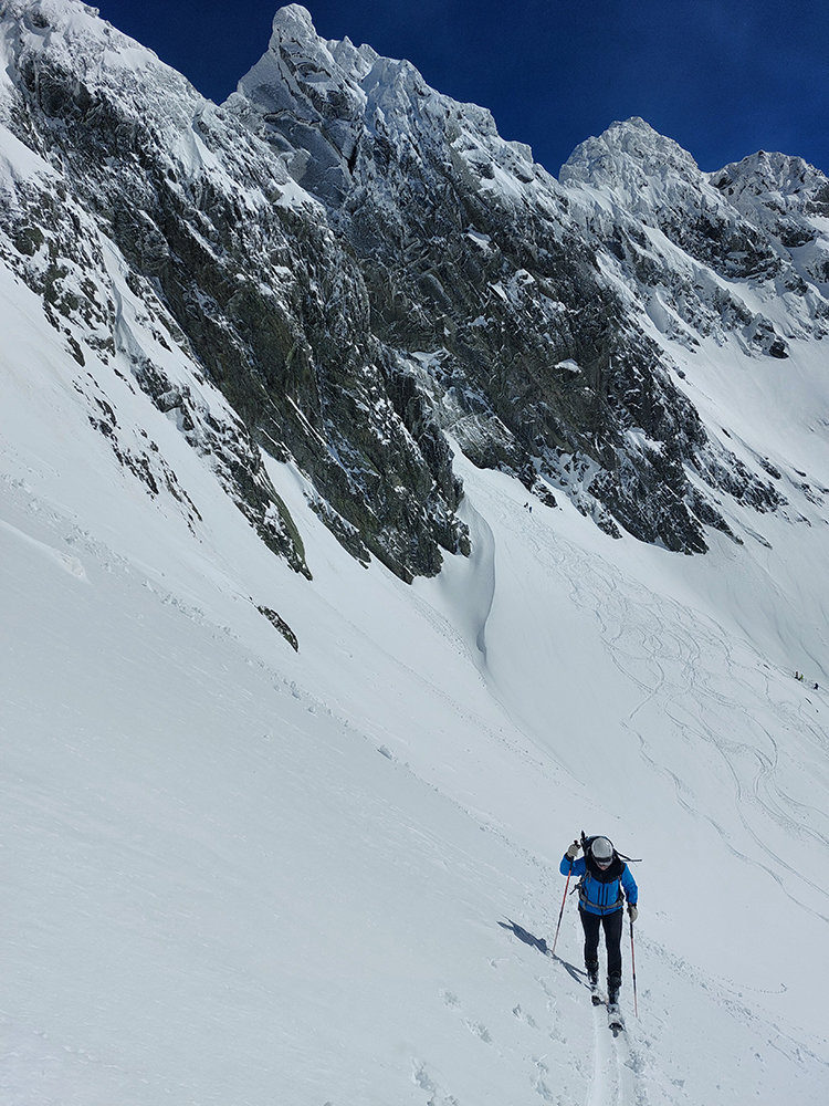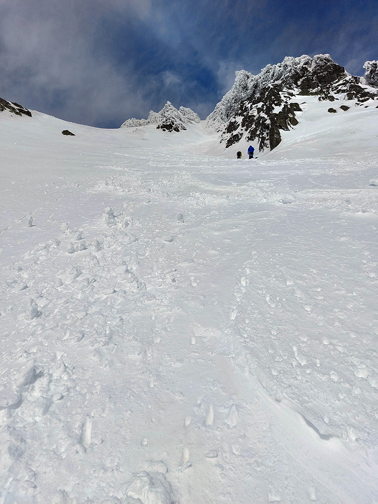 Strmý južný traverz ponad Ľadové pleso, to bol taký hic, že fuj. A suchý sneh hneď sa zmenil na lepidlo. Lenže nezlepené s podkladom. Depo na križovatke výstupov do Východnej Železnej a Zlomiskovej štrbiny: mačky jednoznačne! Tam dole nového snehu aj do 20 cm, hore ale bolo vidno ľad.