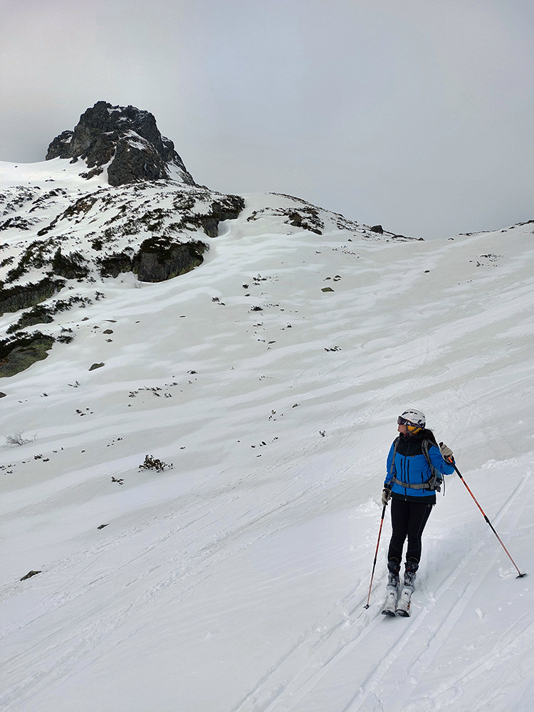 Tak nazad: lyžba nič moc, kombinácia vlhčiny a ľadovej hrčatiny. Nižšie lepšie, homogénnejšie. Zlákala nás čerstvá stopa do Strážneho sedla, našťastie cestou hore moc nepieklo a vietor chladil. Ďakujeme predjazdcom, ktorí to potiahli do Západnej Železnej brány a predjazdkyniam smerom do Strážneho sedla. Ony potom valili nazad dole do Železnej kotliny, my na opačnú stranu, do Kotliny pod Dračím sedlom. Miestami aj príjemná lyžovačka to bola!