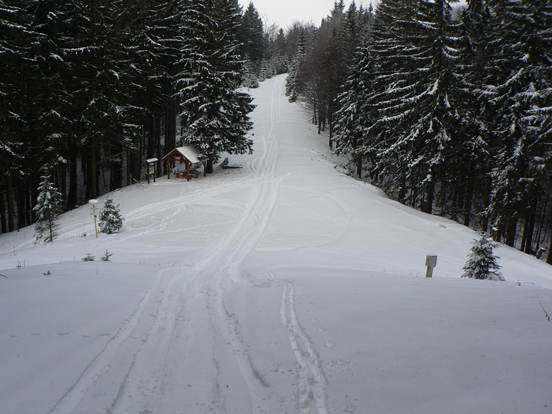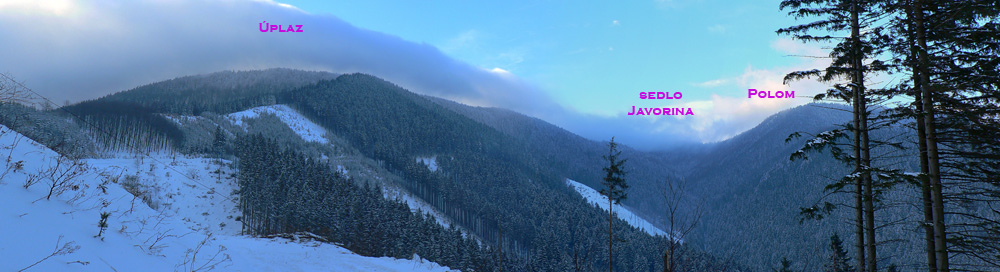 Doteraz pohodové stúpanie, za Saračníkmi je ale najvýživnejší stupák tejto trasy, na Úplaz. Najprv úplazenie rúbaňou (treba sa držať pravej strany), potom ešte strmšie dospelým, našťastie dosť riedkym lesom (značky sú husto na stromoch). Dá sa aj pokľučkovať keď treba. Hlavne že je tadeto nakreslená cyklotrasa :-) Trochu väčší problém v zime je vyššie, kde sa sklon síce zmierni, ale ide sa mladinou. Značka nikde, chodník nikde, konáre po zem a blízko seba. Ale stačí sa držať hrebeňa. Vyššie sa to otvorí do takej hrebeňovej „pololúky“ a tam už sa dá stopa vybrať.