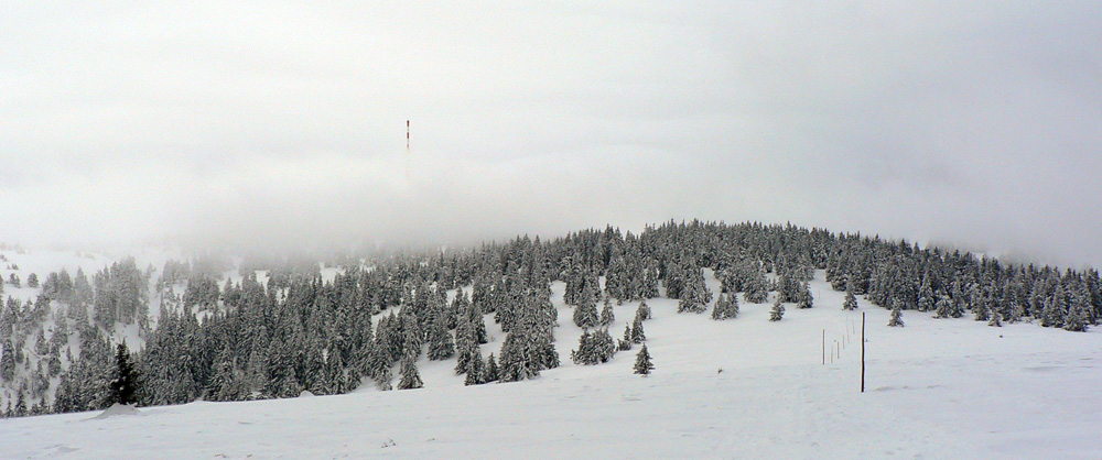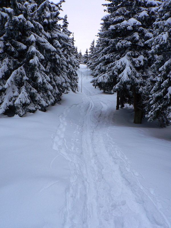 Medzi sedlami Rakytie a Javorina zasnežená zvážnica, len jedny zafúkané staré stopy, ale príliš na široko. Niekto šiel dolu na lyžiach. Čím vyššie, tým viac snehu, hore som dokonca rozmýšľal, že si zalyžujem lesom zo zvážnice na zvážnicu. Tam kde sa zvážnica a značka (a plynovod) v sedle Javorina točia do protismeru o takmer 180 stupňov. Ale odolal som, v lese sa to stále len tvárilo ako v tých frírajderských filmoch, ale nebolo to ono:-)
