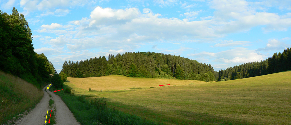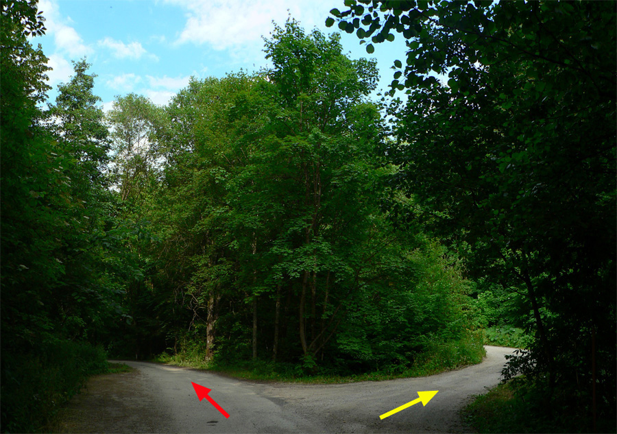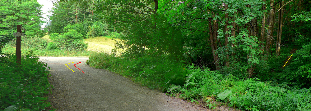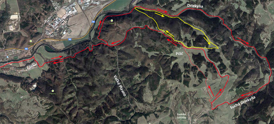 V ústí Driekyne pri smerovníku je niekoľko možností, jedna z nich (so spoločnou časťou trasy) je v podobnom článku TU . Dnes to ale budú dva okruhy. Najprv taký menší a strmší, ktorý začnem aj uzavriem priamo tu v ústí Driekyne. Je jednoduchý, v podstate na každej odbočke sa treba dať doprava. Na mapke je značený žltou. Väčší okruh (červený) začína od smerovníka rovnako, ale ide celou Driekyňou až nad Ponickú Lehôtku. Až tam hore sa točí doprava, aby sa po peknom zjazde lúkami (sú tam dva varianty) na chvíľu spojil s malým okruhom, znovu ho opustil a aby po finálnom zjazde hrkotavou lesnou cestou skončil zas na ceste pri Hrone, ale už bližšie k Bystrici, v ústí Veľkého Plavna:
