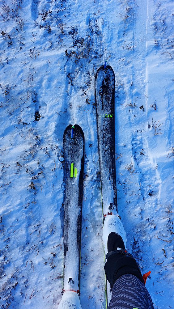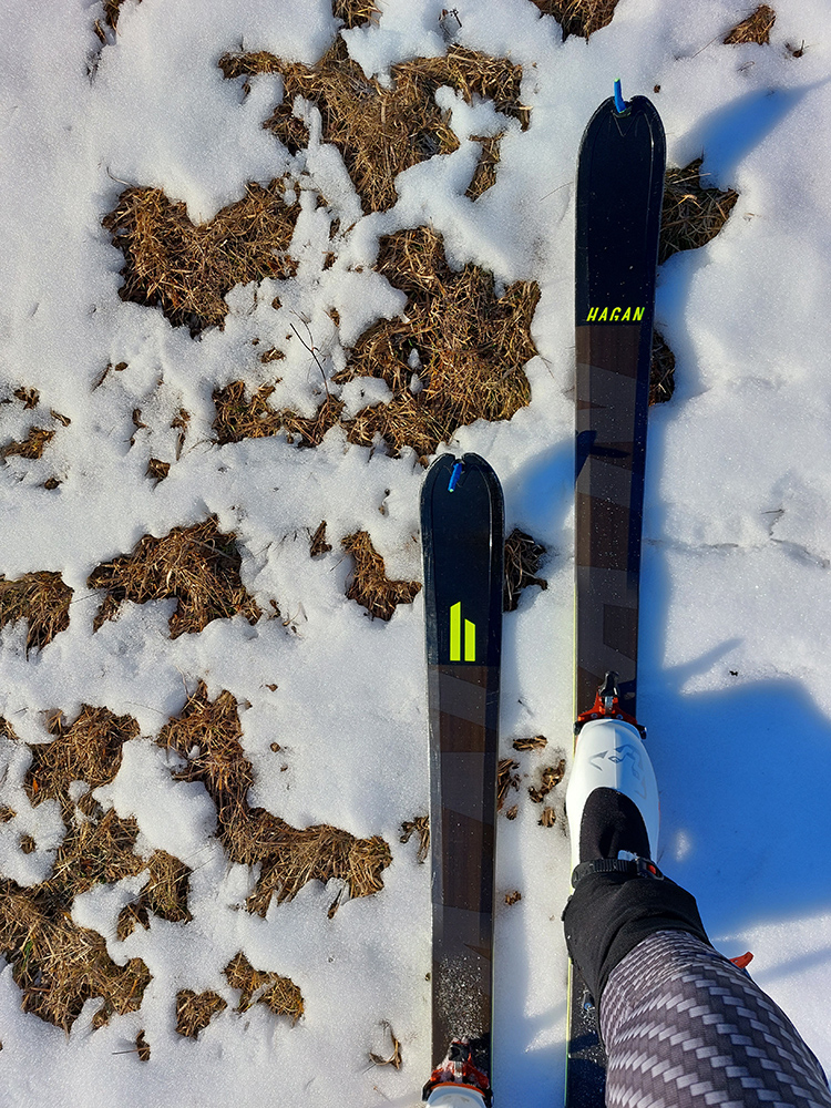 Prešiel som, aj keď stačí jeden, dva dni tepla a nebude sa dať. Prvá lúka nad tým lesíkom, to je kľučkovanie pomedzi kriaky a bodliaky a trávu, ale našťastie takmer súvislá biela vrstva, stále betónový firn. Strmšia pasáž popri lese, to budú smerom dole poriadne krátke oblúky, bude si treba pomôcť miestami aj po rúbanisku povedľa. Sem tam to podšmykne na ľade. Zato za druhým lesíkom konečne mi pod pásmi začína vŕzgať normálny, aj keď dobre premrznutý sneh. Aj buriny ubudlo, tu už zjavne kosia či pasú.