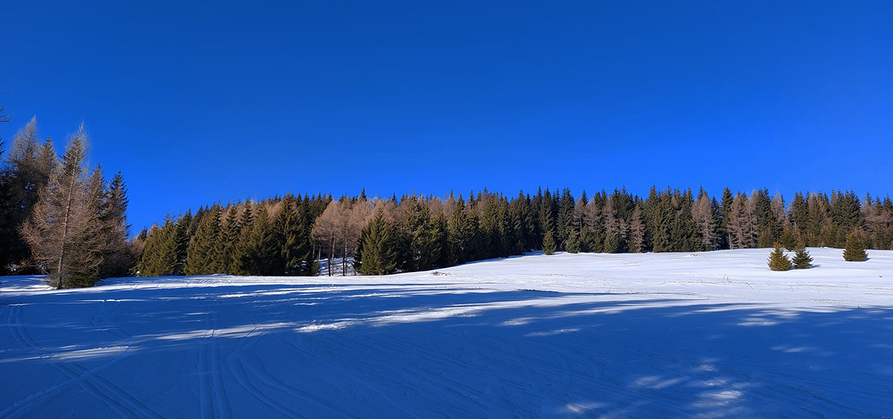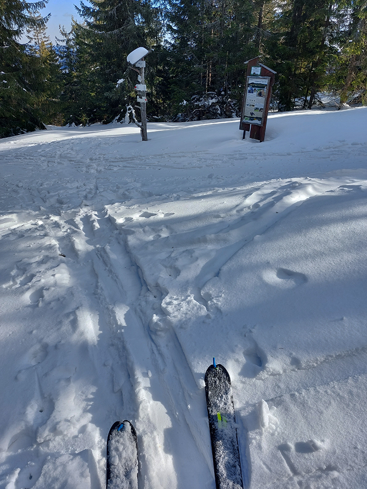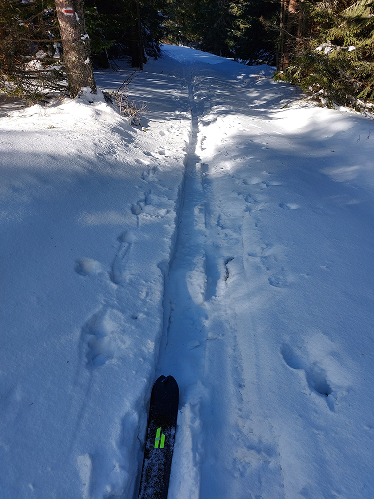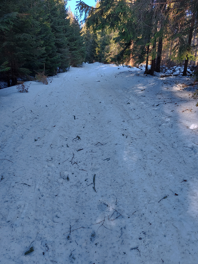 Našťastie až ku vlekom po ceste nemusím: malý mostík cez potok ku studničke a od nej už sa dá pomedzi krtince a trávu aj na pásoch, dokonca aj stopa je! Podklad: aprílový firn, hlboko zmrazený do tenkej kôrky na vrchu a sypkej plnky s bylinnou prímesou pod ňou. Dnes (sobota 12.2.) aspoň že teplota nemá vyliezť nad nulu, tak dúfam, že sem aj zlyžujem. Pod vlekmi ľadový menčester, v prudších pasážach zjazdovky musím poriadne potiahnuť rukami. Vstup do lesa: stopa široká, vyleštená brzdením, ale špinavá od konárikov a šišiek, občas hlinu vidno. Ešte sa pýtam vlekára, či prejdem bez vyzúvania. Nevie.