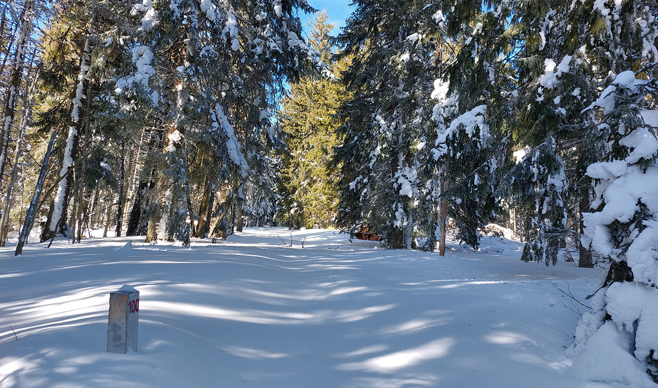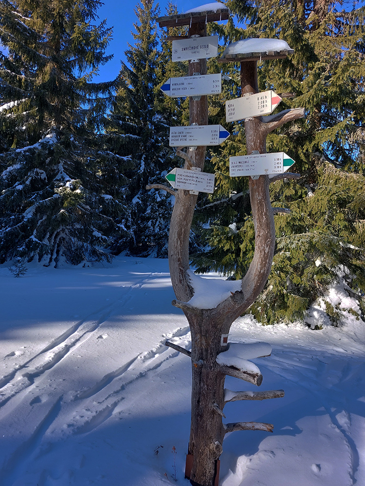 Za smerovníkom Smrečinského sedla začína najväčšia sranda dňa: stopa síce preleštená, ale odbočuje od modrej značky kamsi doľava dole a na značke len súvislé lesné bielo. Neznalý miestnych pomerov si myslím, že to niekto predo mnou sa zamotával, tak prerážam stopu poslušne po modrej. Aj tu sa párkrát zamotávam, keď značky nevidieť, alebo keď ma zlákajú takéto betónové „kilometrovníky“: