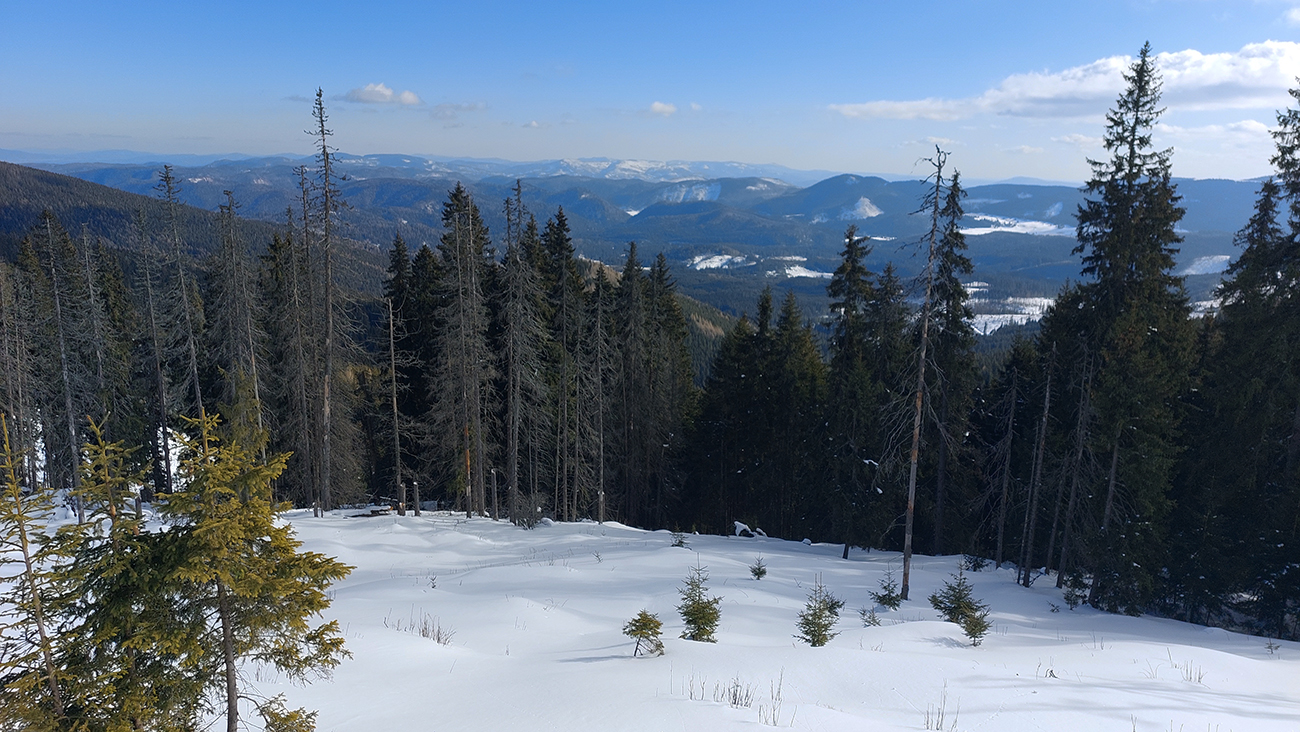 Od rázcestia Morna stopa širšia a viac preleštená smerom na Prednú hoľu, doprava v mojom smere zrazu len zafúkaná „jednokoľajka“, ktorá sa na hnusných, obrovských rúbaniach miestami až stráca. Tak sa trochu motám, lebo ani značiek nieto. Motám sa aj preto, lebo miestami treba kľučkovať pomedzi konáre a pne. Ako som stúpal a s výškou sa otepľovalo, tu na severných svahoch zrazu naopak, poriadna kosa. Pozitívom sú nádherné výhľady na ranné Tatry napravo, ale aj čerstvý poprašok pod lyžami, konečne idem tichšie.