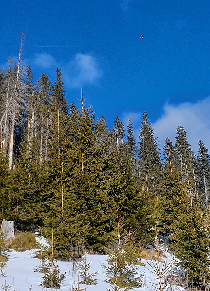 Potom už sa terén otvára a porast znižuje až do kosodreviny, pod pásmi konečne prašan, preto krátky sklz do malej jamky je pohodový aj na pásoch. Len pri návrate tu bude treba lyže do rúk vziať – jedného domáceho tak aj stretám, už sa vracia a dáva mi tip, ktorý odhadujem aj sám takto na diaľku, pri pohľade na Hoľu: nelyžovať nazad od vysielača po značke, ale bokom po hrane žľabu.