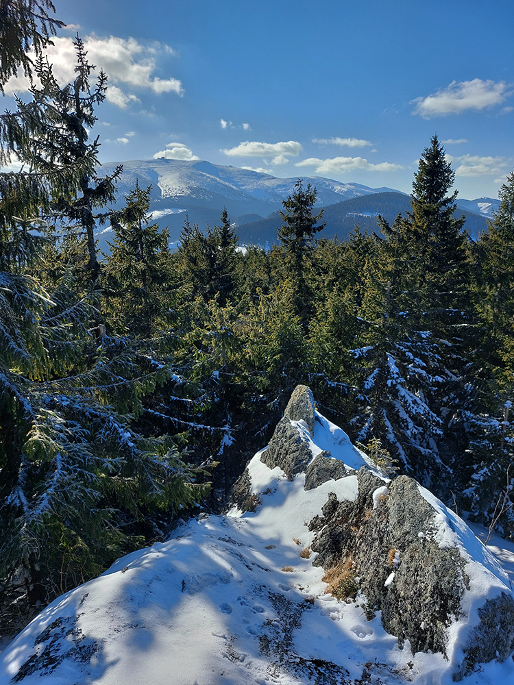 Okolo Martalúzky síce pribúda výhľadov, ale znovu rapídne ubúda snehu. Na výstup dosť, aj keď už miestami po brusniciach stúpam a na kamienky treba dať pozor. Oproti schádza od vysielača človek a hrôza ma chytá, lebo má lyže na chrbte. Príde ale bližšie a našťastie sú to bežky, ufff. Vraj prvý z masového prechodu Šumiac – Kubachy. Tak dúfam, že peší účastníci moc nerozbijú stopu v lese a kľučkujem ďalej v ústrety vrcholu. Miestami je to skoro na haršajzne, aké je to ľadové, aj povrch je tvarom „ľadových zubov“ podobný rašpli tam, kde nejaký súvislý ľad je. Ale to až vyššie, okolo zákruty cesty. Tak tadeto dole veru nie! Tých pár oprotizjazdujúcich aj odkláňam k hrane žľabu, nech sa netrápia popri tyčovom značení.