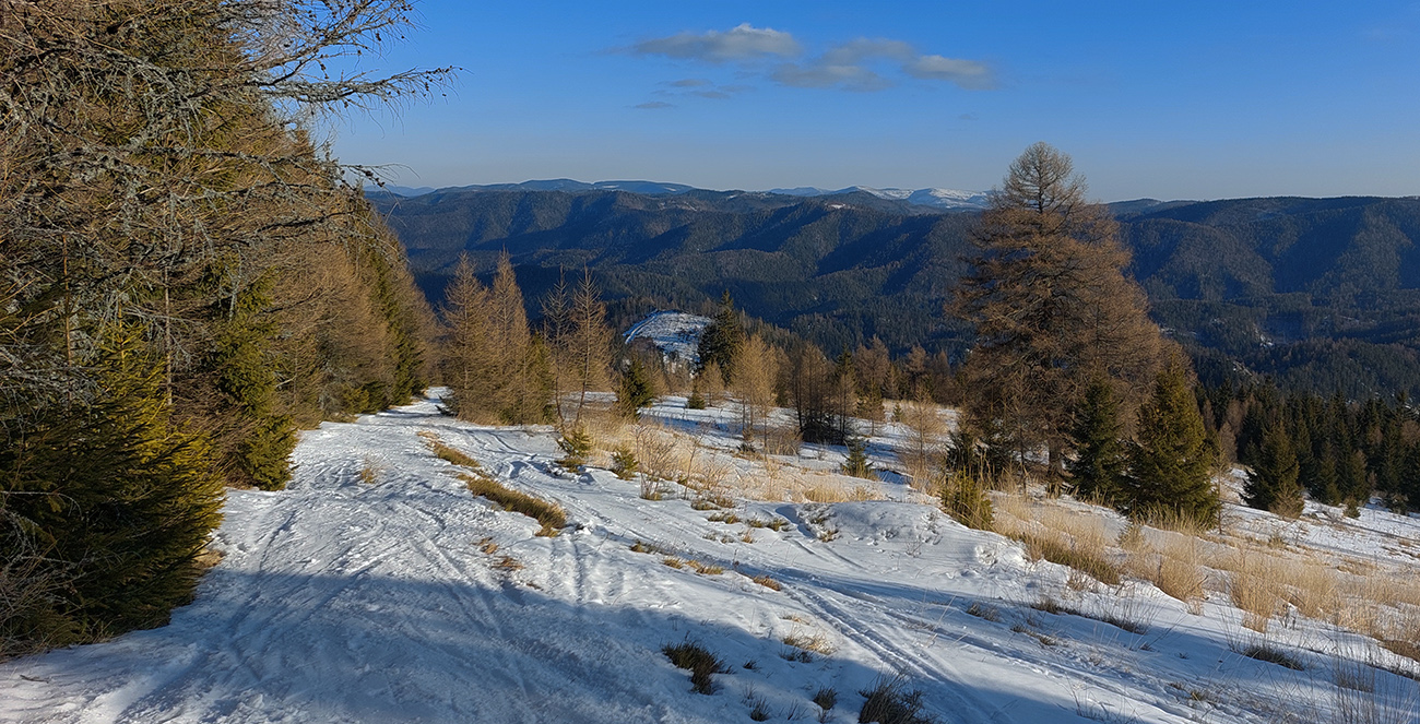 V strmšom zostupe z Úplazu potom neskôr síce stopu pod nohami miestami aj vidím, ale pešiu a poriadne zaviatu, kľučkuje pre lyže až neprijateľne. Na mape ale od začiatku tejto "srandy" registrujem neznačený traverzový chodník trochu nižšie vo svahu, tak sa napájam a to je tá preleštená stopa - tak mi dochádza, že miestni znalci v zime tento úsek traverzujú. Aj smer dobrý, vpredu zase cez rúbanisko svieti Hoľa. Doľava, na východ, vidno do diaľky Volovských vrchov, neviem, či správne identifikujem Kojšovskú hoľu. V poslednom strmšom, užšom prechode cez les aj stromy zrazu vyzerajú ako v zime, krásne olepené snehom.