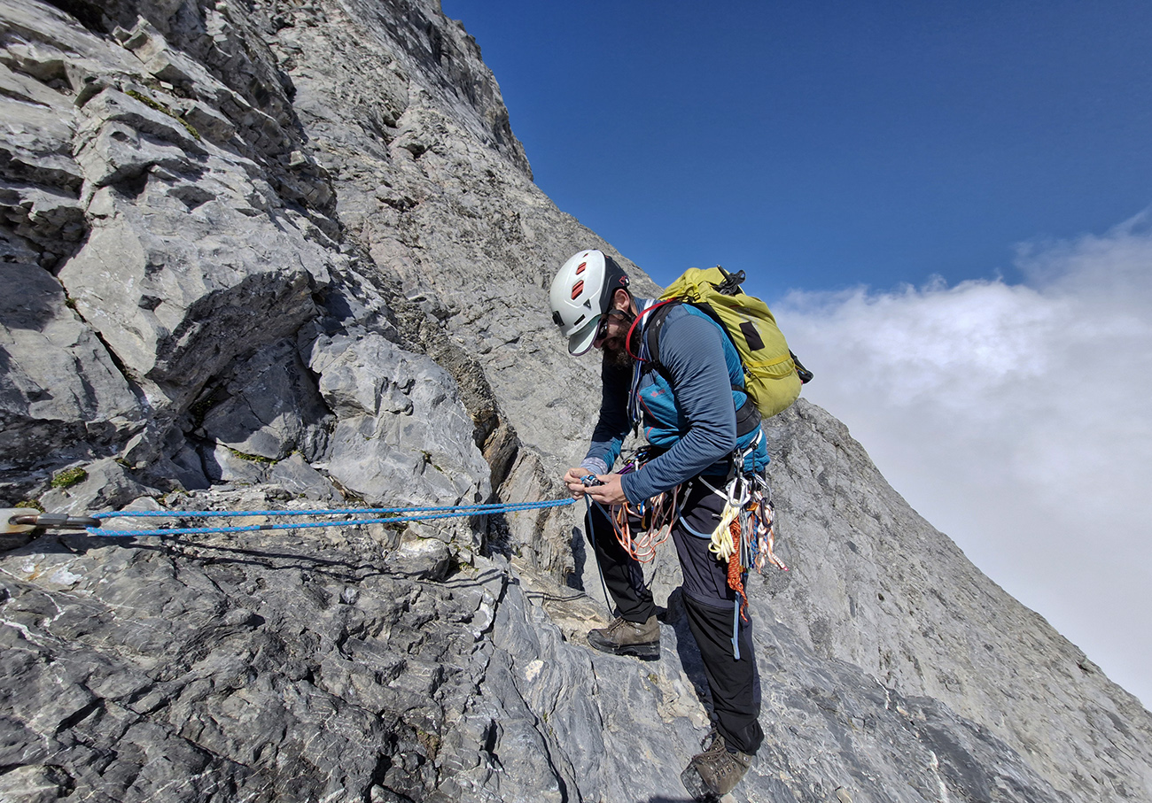 Rampa: Keď sa blížime pod druhý serak, stopy sa rozdelia. Prirodzene vyberáme tú menej ohrozenú. Ukáže sa to ako chyba, a chvíľu nám preto trvá, kým nakoniec nástup do lezeckej dĺžky nájdeme. Je to nitmi dobre odistená platňa za IV, a pre ašpirantov na hrebeň Mittellegi vraj slúži ako kanárik. Ak vylezieš toto, na hrebeni by už mali byť len ľahšie problémy. Ok, trochu ma v nej síce poklepe, ale je suchá, nitov je v nej dosť, spoďáky berú a i na nohy vo vibramkách sa vždy nakoniec nájde niečo rozumné. Mám dobrý pocit. Rýchlo dolezieme i druhú, už triviálnejšiu dĺžku, zbalíme lano a terénom za I-II sa vydáme nie celkom viditeľnou rampou po úzkych chodníčkoch krížom stenou, ponad ktorú sa tiahne hrebeň Mittellegi. Chata je teraz dlhšie schovaná za horizontom, občas poblúdime, a pri pohľade dolu stenou nevznikajú žiadne pochyby o tom, ako by prípadný pád skončil. S si ale cestu pochvaľuje a moje obavy preto pripisujem hlavne spánkovému deficitu. A tomu pravidelnému hukotu od padajúcich serakov, ktoré ma vždy vystrašia. Sústreď sa kámo, je to choďák, stačí nezakopnúť.