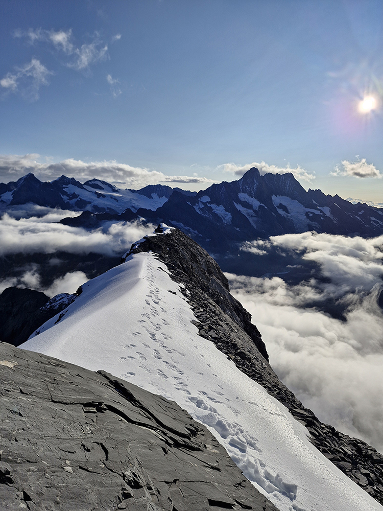 Dopoludnie: Vychádza slnko, vypíname čelovky a pokračujeme hrebeňom. Horizontálne úzke úseky sa striedajú s lezeckými pasážami. Snehu pribúda v oboch, ale väčšinu stále lezieme simultánne. Keď sa objavia prvé fixy, mladí nám trochu odlezú na jednu - dve dĺžky. Vzájomná komunikácia trochu ustane, zato však postupne tvrdne terén. Viac a viac si netrúfame liezť simultánne, a i hľadanie vhodných miest a budovanie vlastných štandov zaberá čas. I cesta naspäť na chatu je každým ďalším výlezom uzavretejšia. Prestávam trochu vnímať, ako rýchlo sa slnko presúva po oblohe, sústredím sa na lezenie. Väčšina ma baví, občas je náročnejšie. Každú chvíľu vyhliadam, kedy nám prvý párik zmizne zlaňákom z Grosser Turm, ktorý má veštiť záverečný výšvih na Eiger.