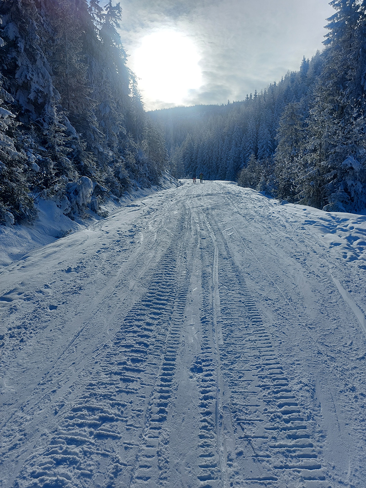 Ozaj parádna „zjazdovka“ to bola, aj nejaké stopy po menčestri na nej, takže ju isto aj mašinou prebehli. Poriadne nesnežilo už dlho, tak aj do viacerých domorodých odbočiek stopy naťahané a vyleštené - preskúmame nabudúce. Mrzlo fajne v doline, ale na slnku sme sa rýchlo pozohrievali, joj paráda!