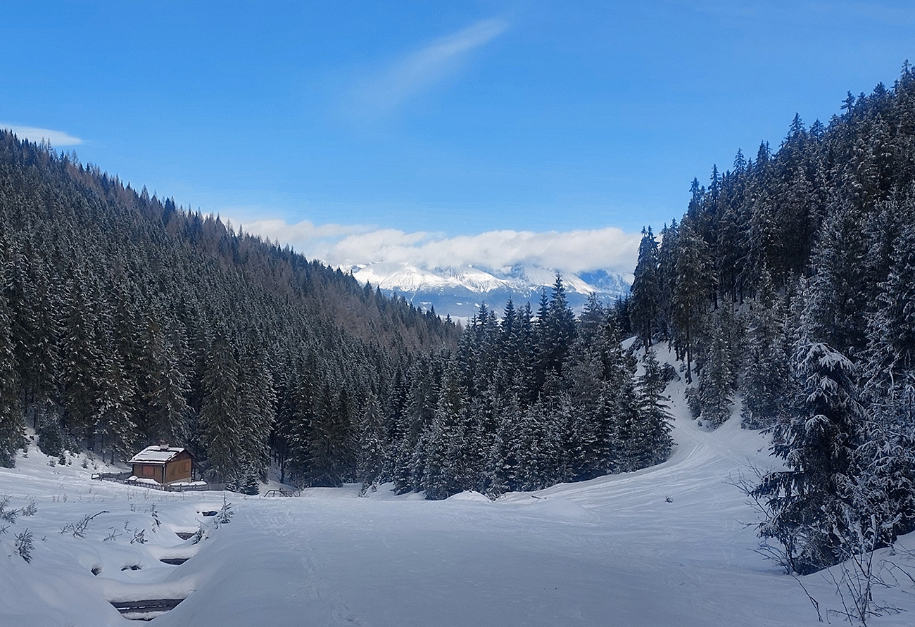 Dalo by sa pokračovať v oblúkovaní až na dno Ždiarskej doliny k tomu smerovníku, ale že radšej nalepíme a prepásujeme sa k tej svetoznámej „búde nárekov“. Lyžovačka pre spestrenie vraj cestou nazad, možno...