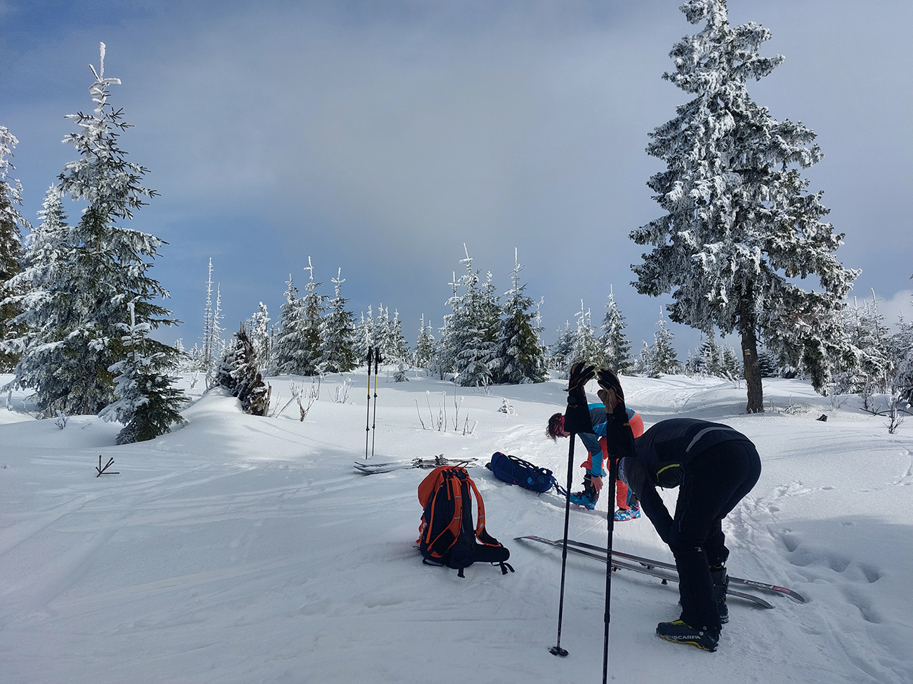 A vôbec to po odmäkoch nebolo ľadové, na starom firne ľahký, premrznutý poprašok, pohodlné! Takže super aj neskôr, pri zjazdoch na pásoch – netrpeli chlpy na ľade a ticho bolo. Hore nad lesom pekný spätný výhľad na Tatry, kde sa ozaj na hrebeňoch dáke chuchvalce držali, zdalo sa: