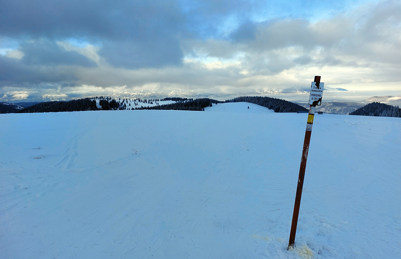 A z Panskej hole samozrejme ďalej na pásoch: po pláňach popod Smrečiny až nad vlek, nech je zmena. Tam už sa viac ľudí korzovalo. Slnko sa definitívne sklonilo a skrylo za sivú hradbu, tak aj okolie trochu stmavlo, ale severy stále ožiarené.
