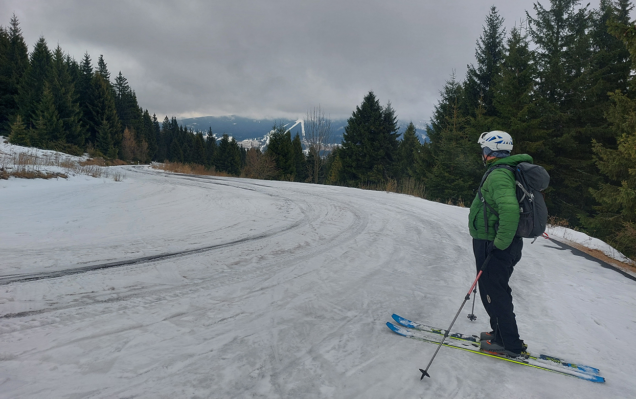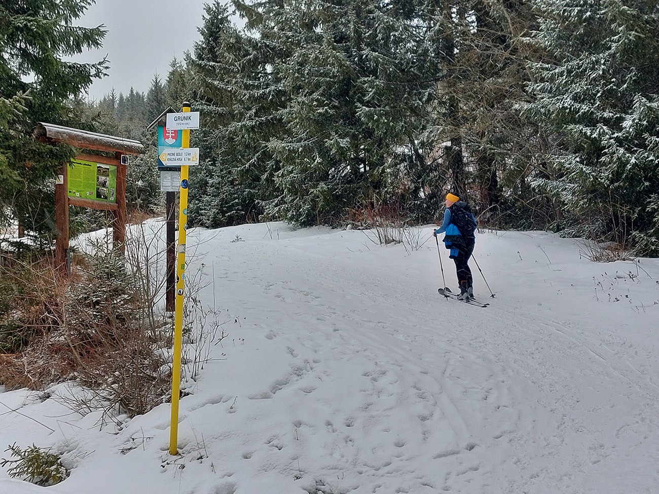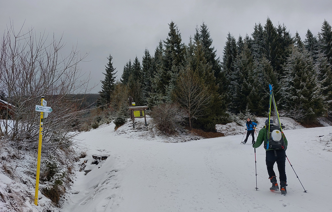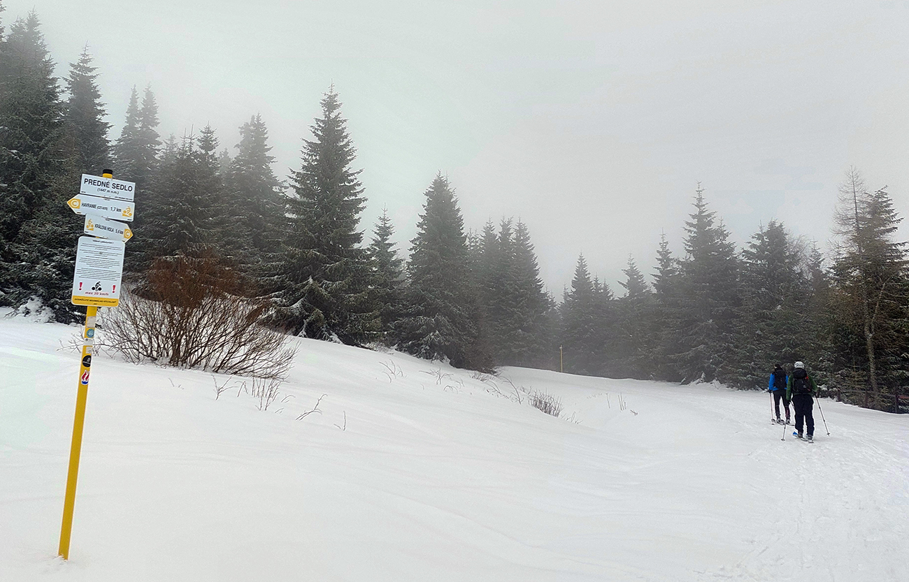 Hneď na úvod – nedá sa od parkoviska! Ale má snežiť, po ceste to pôjde. Lebo na valentínsku sobotu bolo hlásených málo oblakov, žiadny vietor (ani hore!) a teplota tak do -6. Nemohol som odolať ponuke na odvoz, sám to mám z domu priďaleko. Do soboty rána síce na predpovedi pribudli oblaky, inak ale nič, tak v aute všeobecný optimizmus. Ten sa ale cestou dooooosť rozplýval. No už nebolo cesty nazad. Tak v Šumiac – city sme oferovali tri Eurá parkovného a našli sme hádam posledné miesto pod rampou. Tí, čo potom zaparkovali nad rampou, doooosť draho obišli. Keď sa poobede dole vrátili, už ich čakali „štátni výbercovia“. Vystupovali sme do poriadne hustého sneženia, ktoré hneď zakrylo zvyšky ľadu na ceste. Niektorí optimisti skákali do lyží už pri autách - hore cestou sa dalo, len potom vytopený úsek, bolo treba pár stoviek metrov nad rampou preniesť. My sme poctivo vyniesli na batohoch po turistickom chodníku až na serpentínu cesty na Skaličke (1100 m). O poschodie vyššie na Grúniku (1300 m) sme sa už odvážili aj mimo cestu. Odtiaľ sa už podklad rýchlo zlepšoval – snehu pribúdalo a práve potiaľ by som si to trúfol zlyžovať aj mimo cesty.