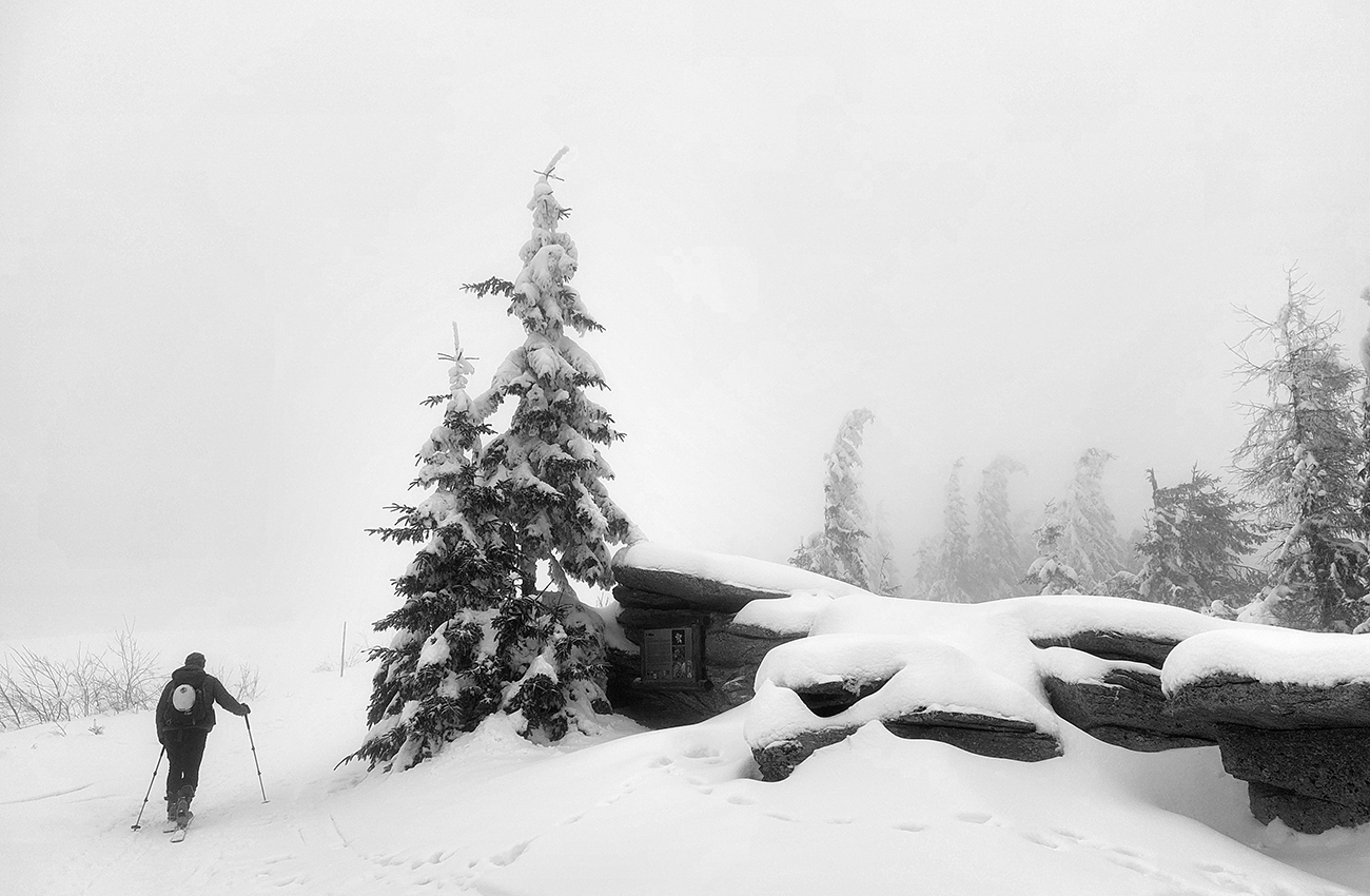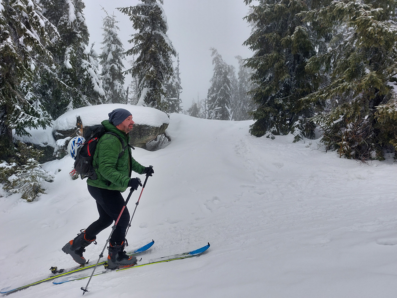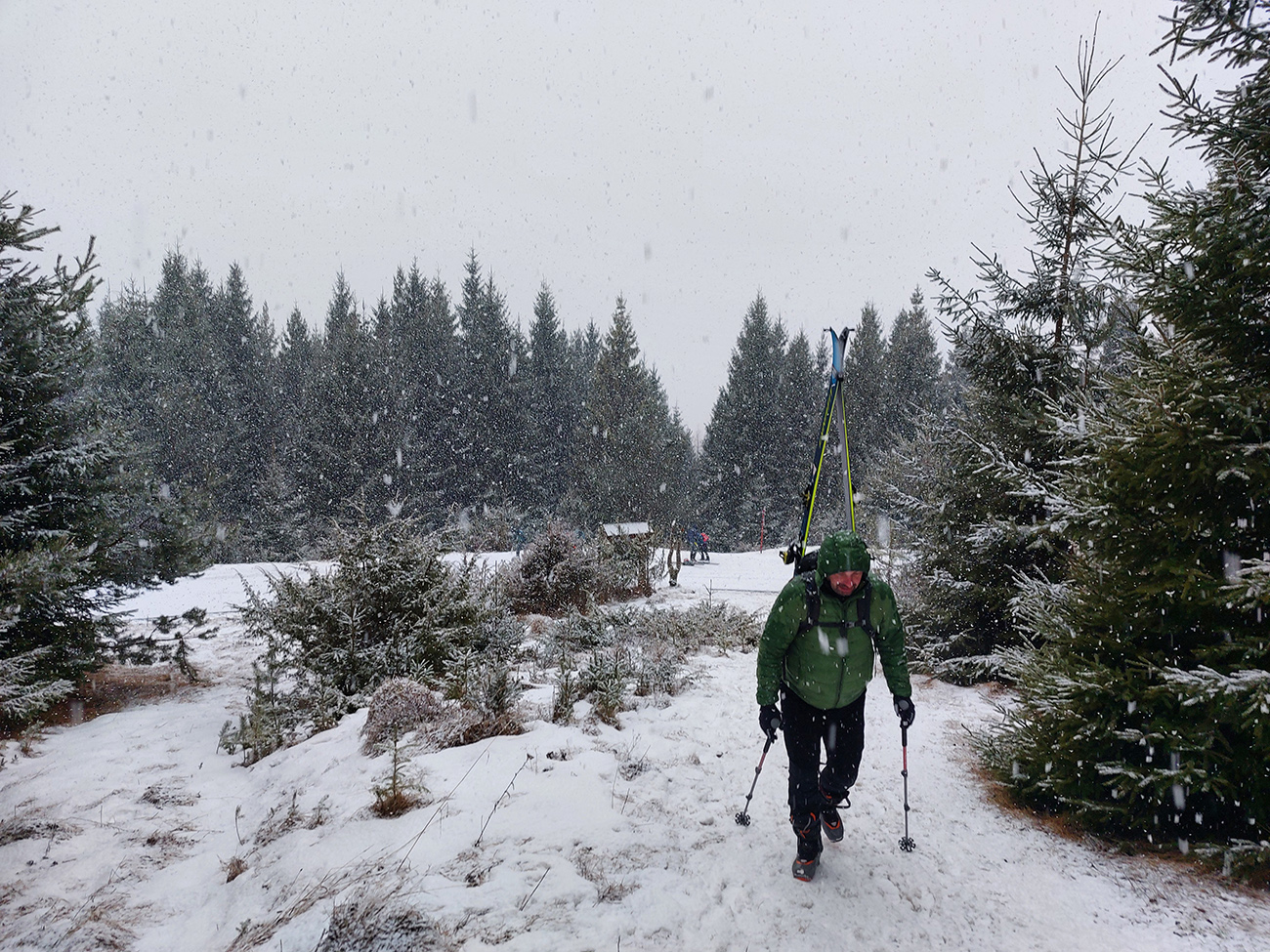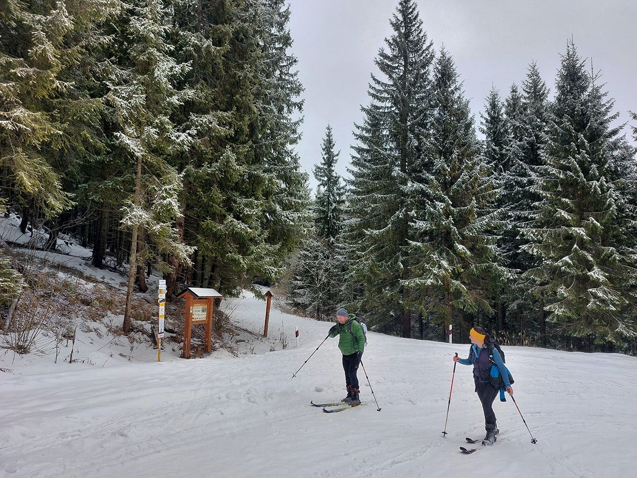 Hneď na úvod – nedá sa od parkoviska! Ale má snežiť, po ceste to pôjde. Lebo na valentínsku sobotu bolo hlásených málo oblakov, žiadny vietor (ani hore!) a teplota tak do -6. Nemohol som odolať ponuke na odvoz, sám to mám z domu priďaleko. Do soboty rána síce na predpovedi pribudli oblaky, inak ale nič, tak v aute všeobecný optimizmus. Ten sa ale cestou dooooosť rozplýval. No už nebolo cesty nazad. Tak v Šumiac – city sme oferovali tri Eurá parkovného a našli sme hádam posledné miesto pod rampou. Tí, čo potom zaparkovali nad rampou, doooosť draho obišli. Keď sa poobede dole vrátili, už ich čakali „štátni výbercovia“. Vystupovali sme do poriadne hustého sneženia, ktoré hneď zakrylo zvyšky ľadu na ceste. Niektorí optimisti skákali do lyží už pri autách - hore cestou sa dalo, len potom vytopený úsek, bolo treba pár stoviek metrov nad rampou preniesť. My sme poctivo vyniesli na batohoch po turistickom chodníku až na serpentínu cesty na Skaličke (1100 m). O poschodie vyššie na Grúniku (1300 m) sme sa už odvážili aj mimo cestu. Odtiaľ sa už podklad rýchlo zlepšoval – snehu pribúdalo a práve potiaľ by som si to trúfol zlyžovať aj mimo cesty.