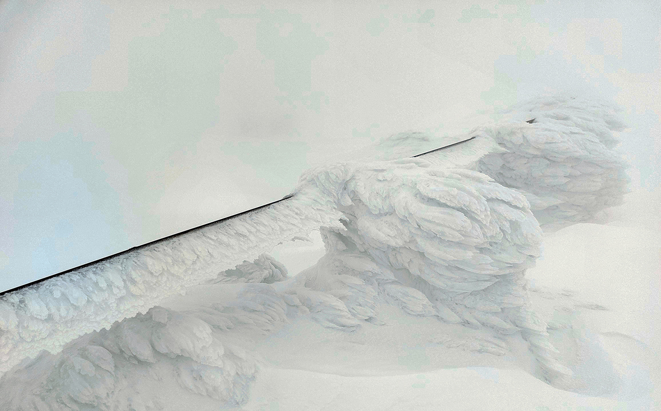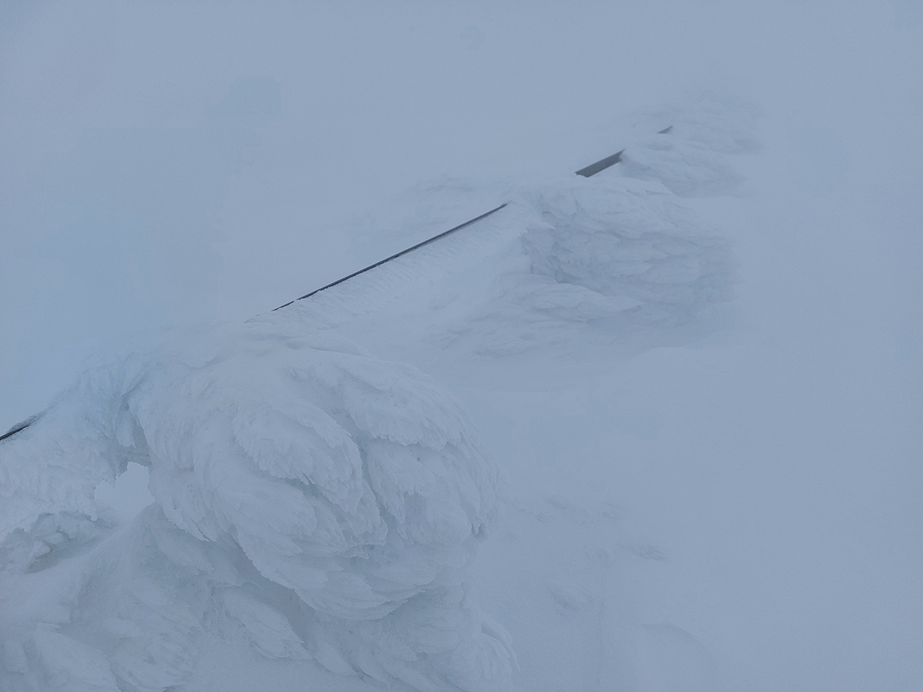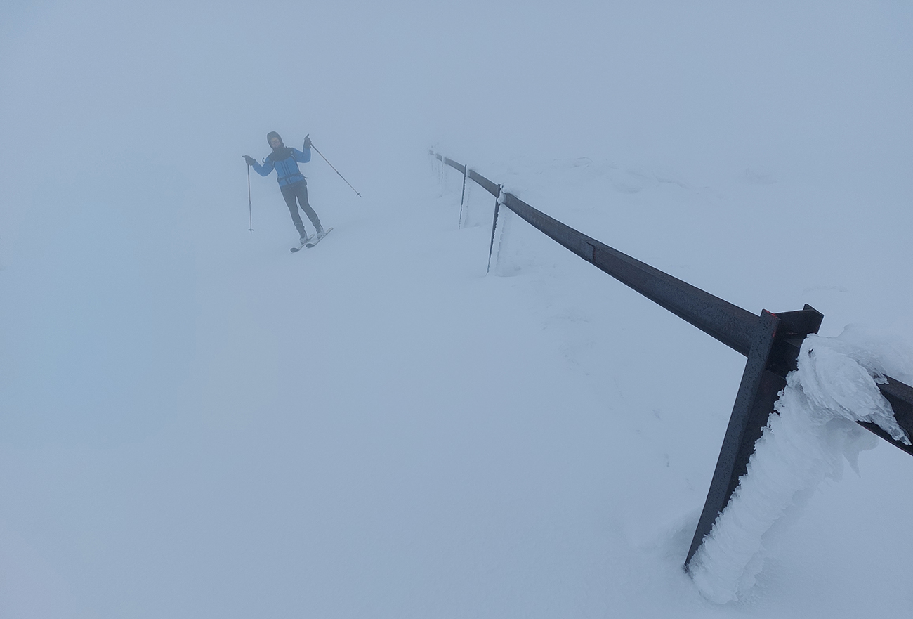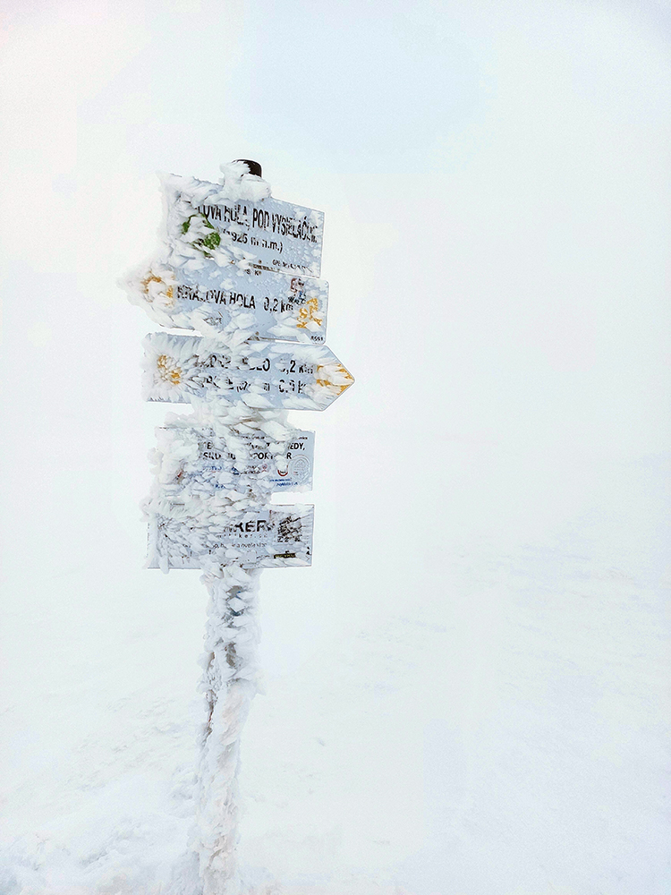 Počasie však čoraz horšie – jz víchor sa dvíhal. Našťastie ešte cestou hore tlačil do chrbta, viditeľnosť však nulová, difúzna. Aspoň, že na nás snežiť prestalo, v tom predpoveď vyšla. Iba dáke ihličky vzduchom lietali. Takže hore pekne po tyčiach a rýchlo do závetria za východnú stenu vysielača, pred vchody ku trafákom – jeden bol dokonca otvorený (či vylomený?) a interiér za ním zjavne už mnohým poslúžil.