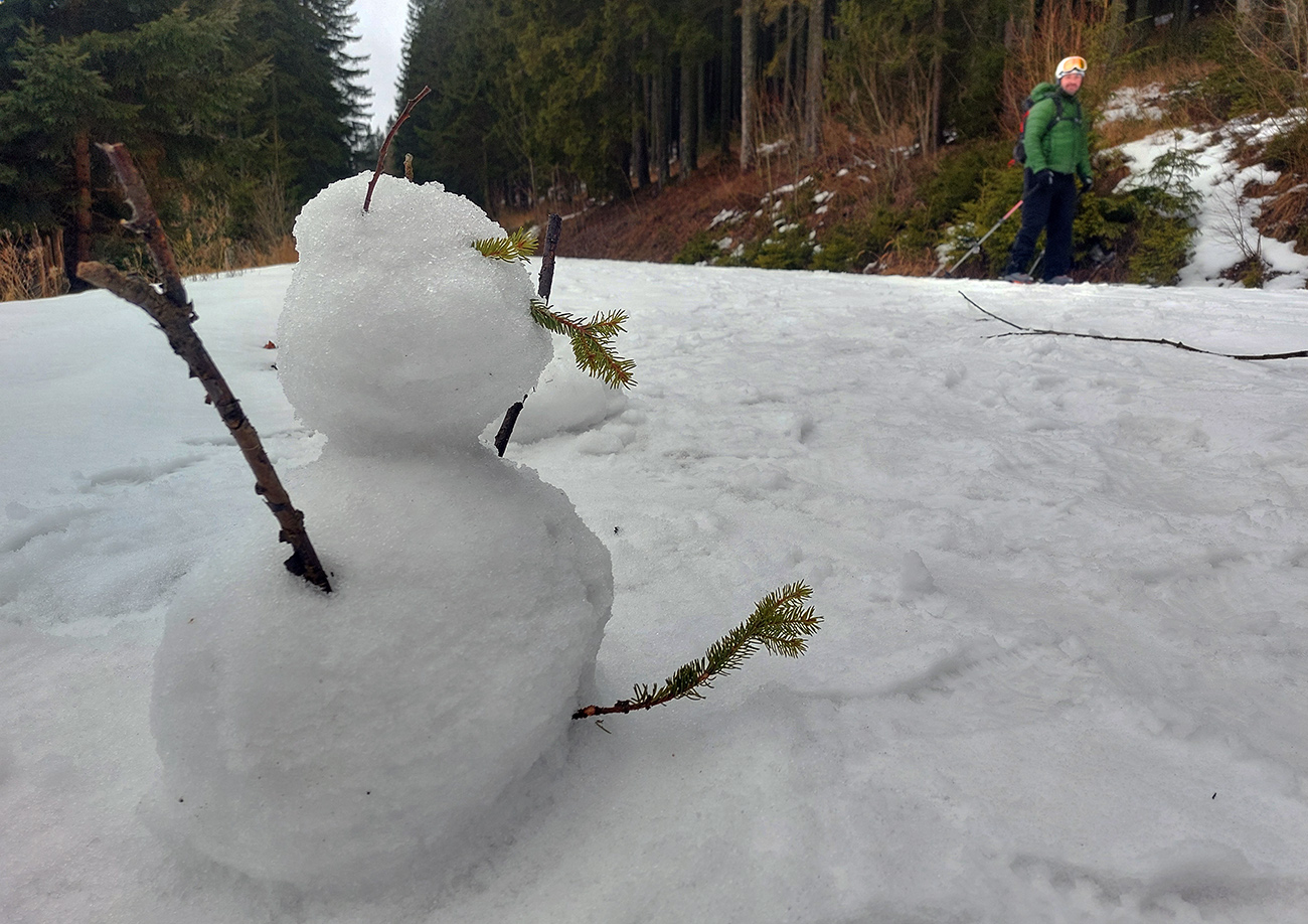 Až nižšie, po vjazde medzi kríky okolo cesty, sme niečo pod nohy videli. Veľa ľudí to tam, na hranici neviditeľnosti, aj otáčalo. Lenže aj tam to už vŕzgalo pod nohami a pri chate sneh už navlhnutý. Posedeli sme pri polievke, dali ešte jeden výšľapík po tú hranicu krovín - a už len dole. Pekne po ceste.