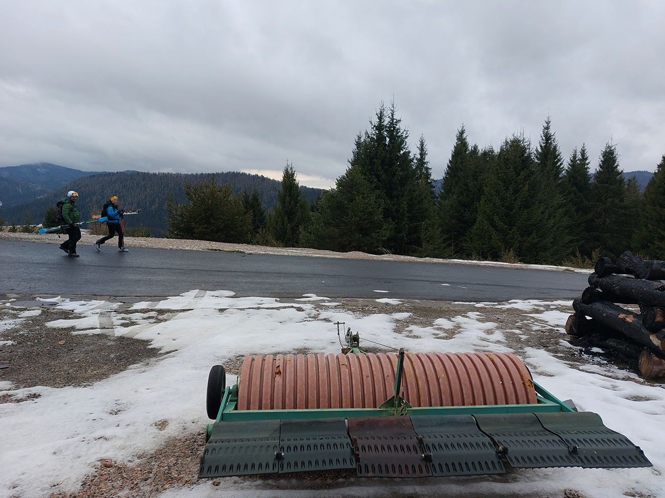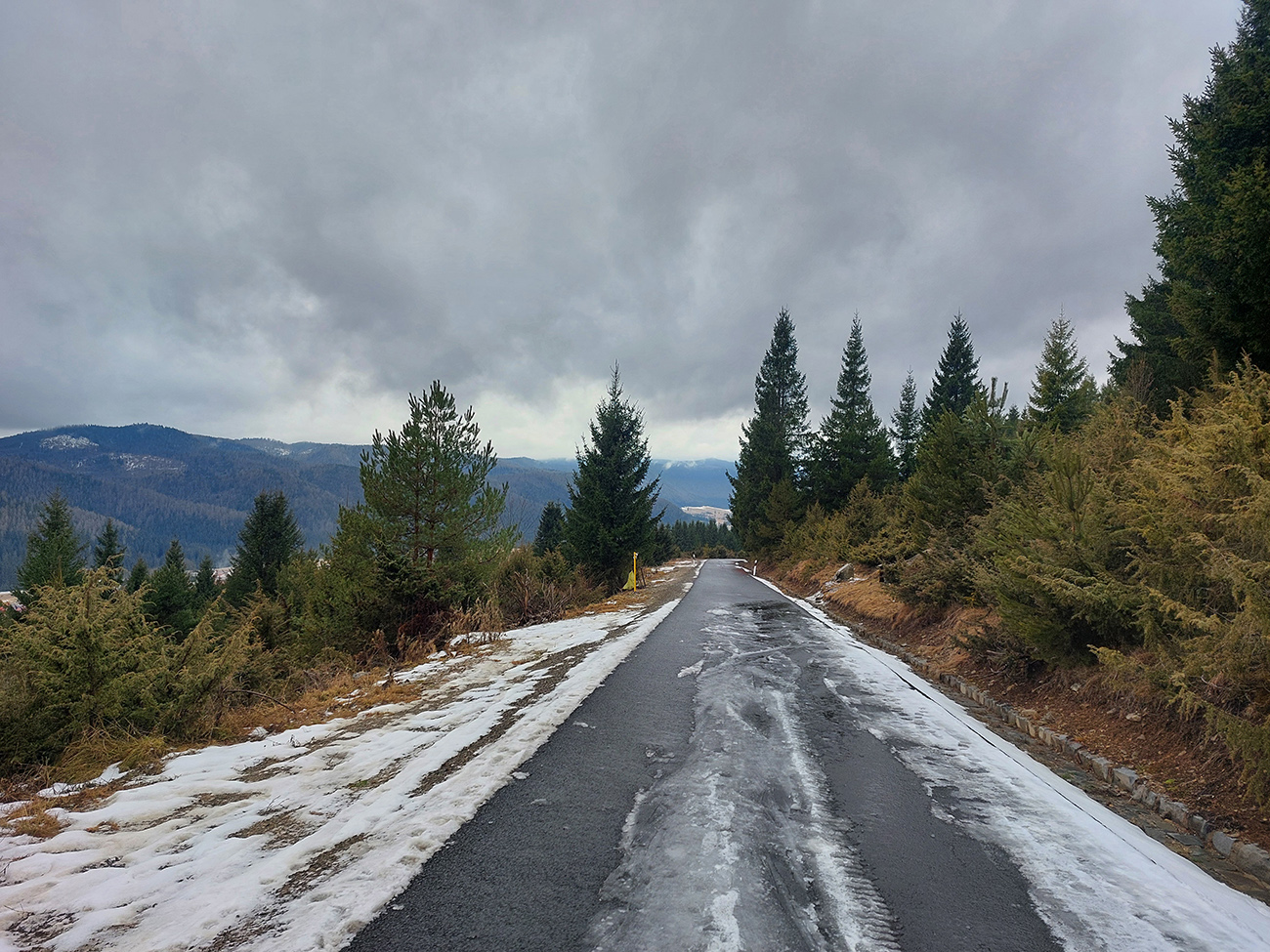 Cesta uvalcovaná, rovná, pod popraškom mokro ľadová – čím nižšie, tým mokrejšia. Na otvorených úsekoch miestami aj koľaje až na asfalt. Vyzuli sme niekde medzi spodkom kalvárie a odbočkou modrej značky (asi 960 m).