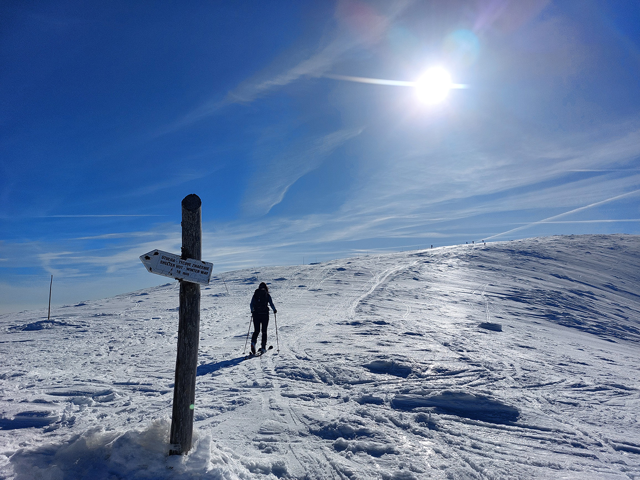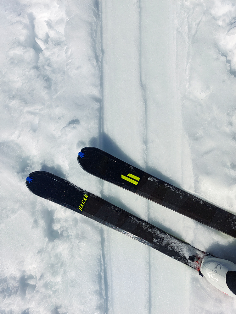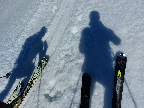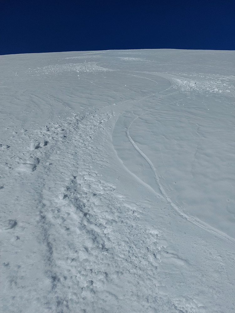 Prvé slabšie kusy už predtým emigrovali do útulne, teraz ďalšie dva, tak sme cestou dohodli časovo približnučké stretko na hrebeni a my čo ešte nabudení, davaj do severu. Pekne popri rázcestníku na hrebeni, že cez prevej dropneme backflipom priamo do tej muldy, z ktorej nedávno lavínka padla. Dole na dne ju vidieť, poriadne hrčovisko. Prevej ale slabý, tak sme nakoniec točili oblúky o jednu muldu na východ. Tam to bolo síce už pevnejšie a suchšie pod lyžami, ale dobré len na vrchu. Nižšie sneh veľmi nekonzistentný svojimi vlastnosťami, ktoré sa menili doslova v každom oblúku (vlhko, sucho, dosky, vankúše, mäkko, tvrdo...) a dosť nepríjemne to ťahalo za lyže.