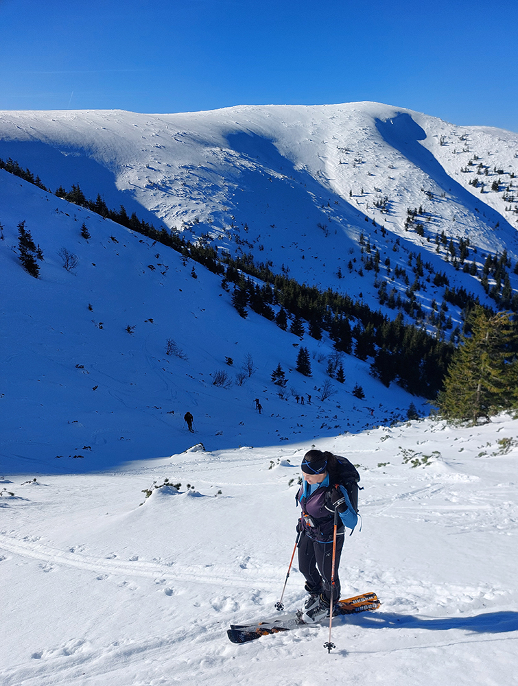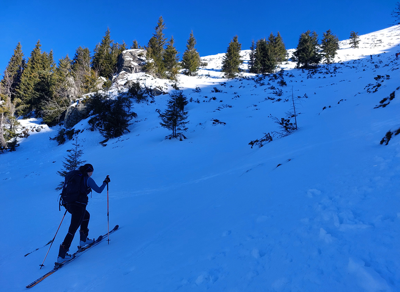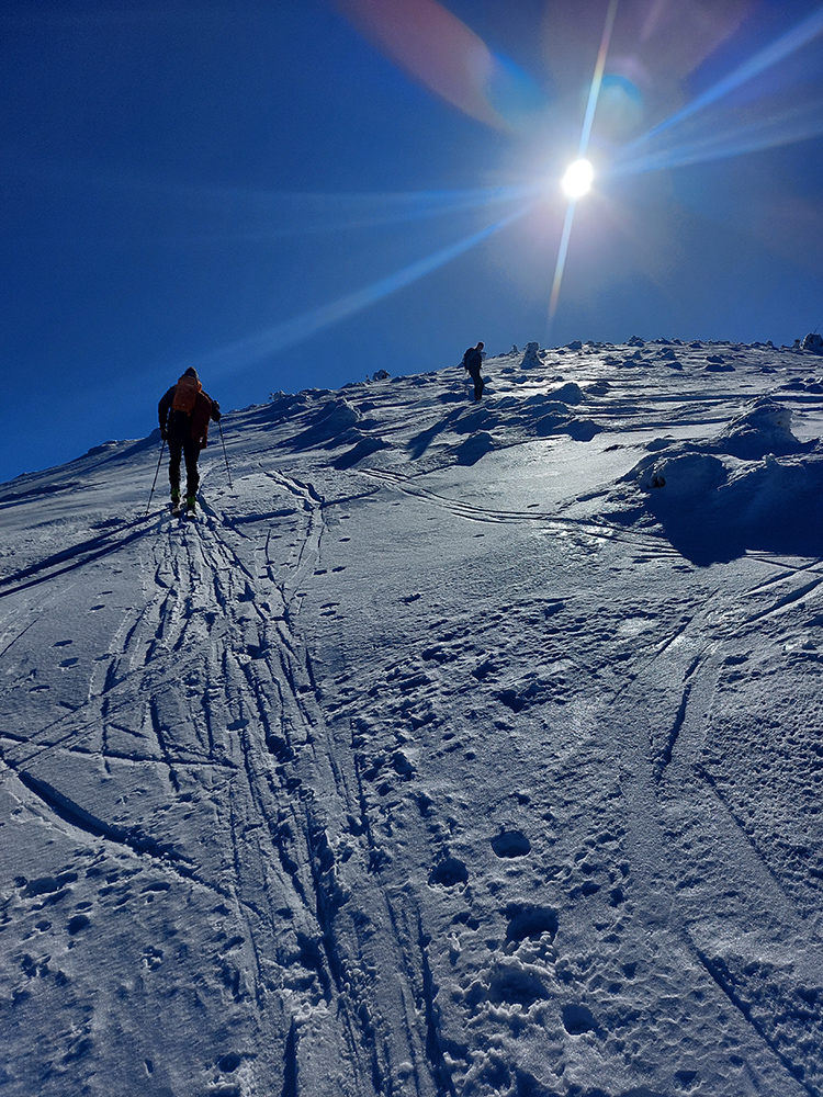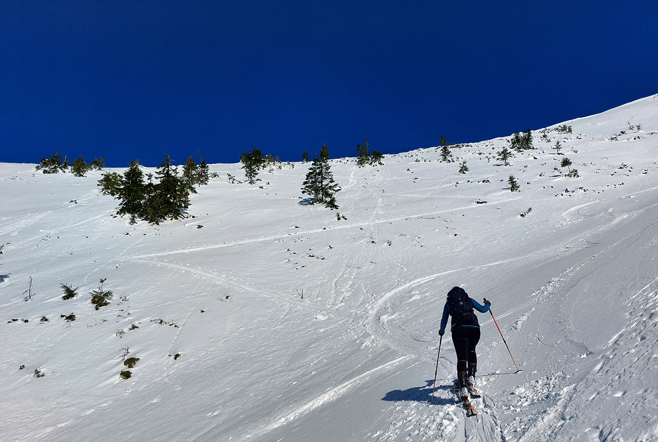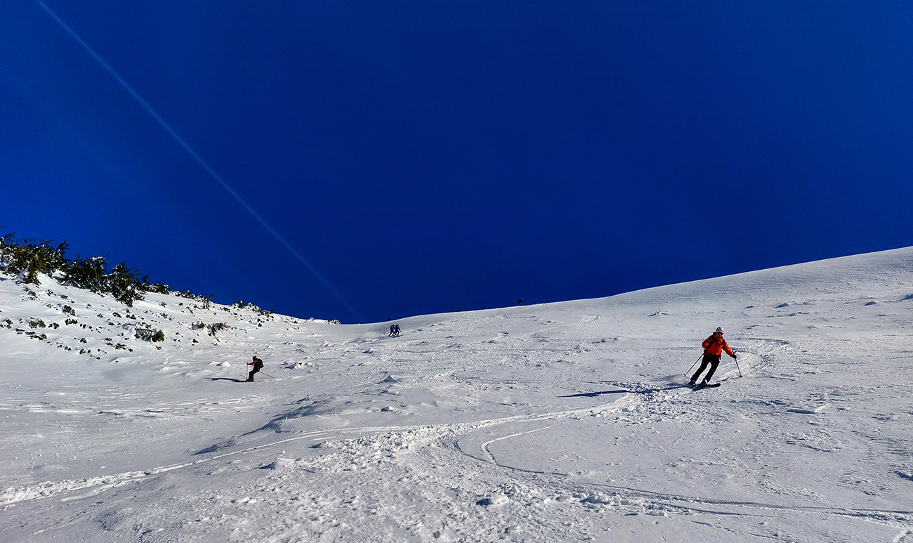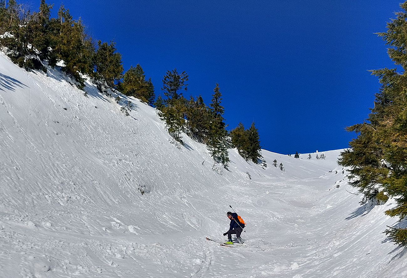 Ako sa to otvorilo, už sme si mohli vyberať, ktorou muldou na hrebeň. Vrhli sme sa najviac doľava, čiže do najširšej, najviac nasvietenej – aj keď len vo vrchnej časti. Čo najbližšie k Ďurkovej, aj keď reálne to najbližšie samozrejme nebolo. Ale nižšie v tieňoch zmrznutý sneh ako šmirgeľ, fasa držal, dalo sa aj v strmom pekne direkt po spádnici. A mimo stopy aj lepšie, lebo tá bola niekde až na ľad vyleštená. Potom vyššie, v strmých cikcakoch na slnku už to bolo trošku povolené. Spätné výhľady samozrejme maestro grandiózo.