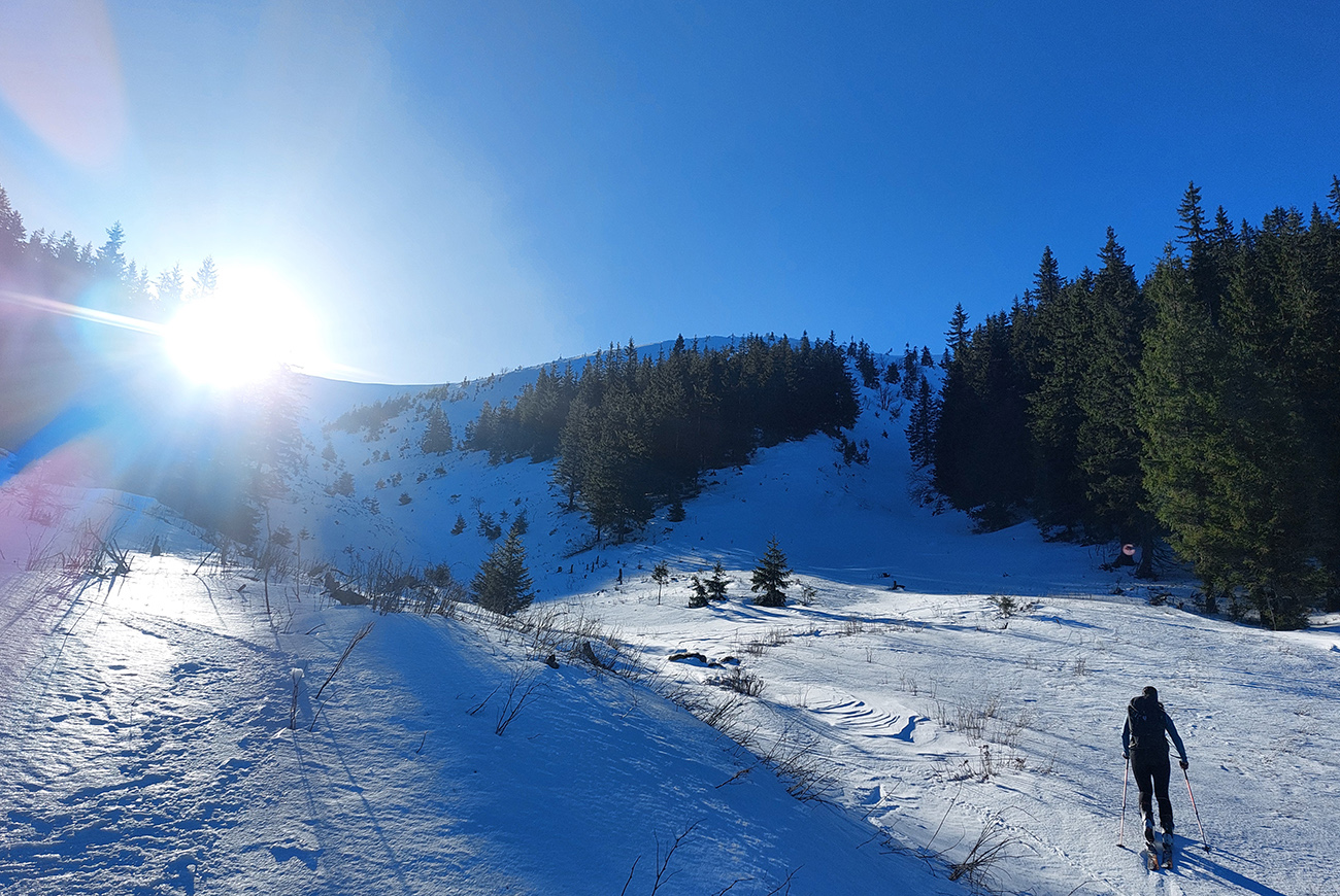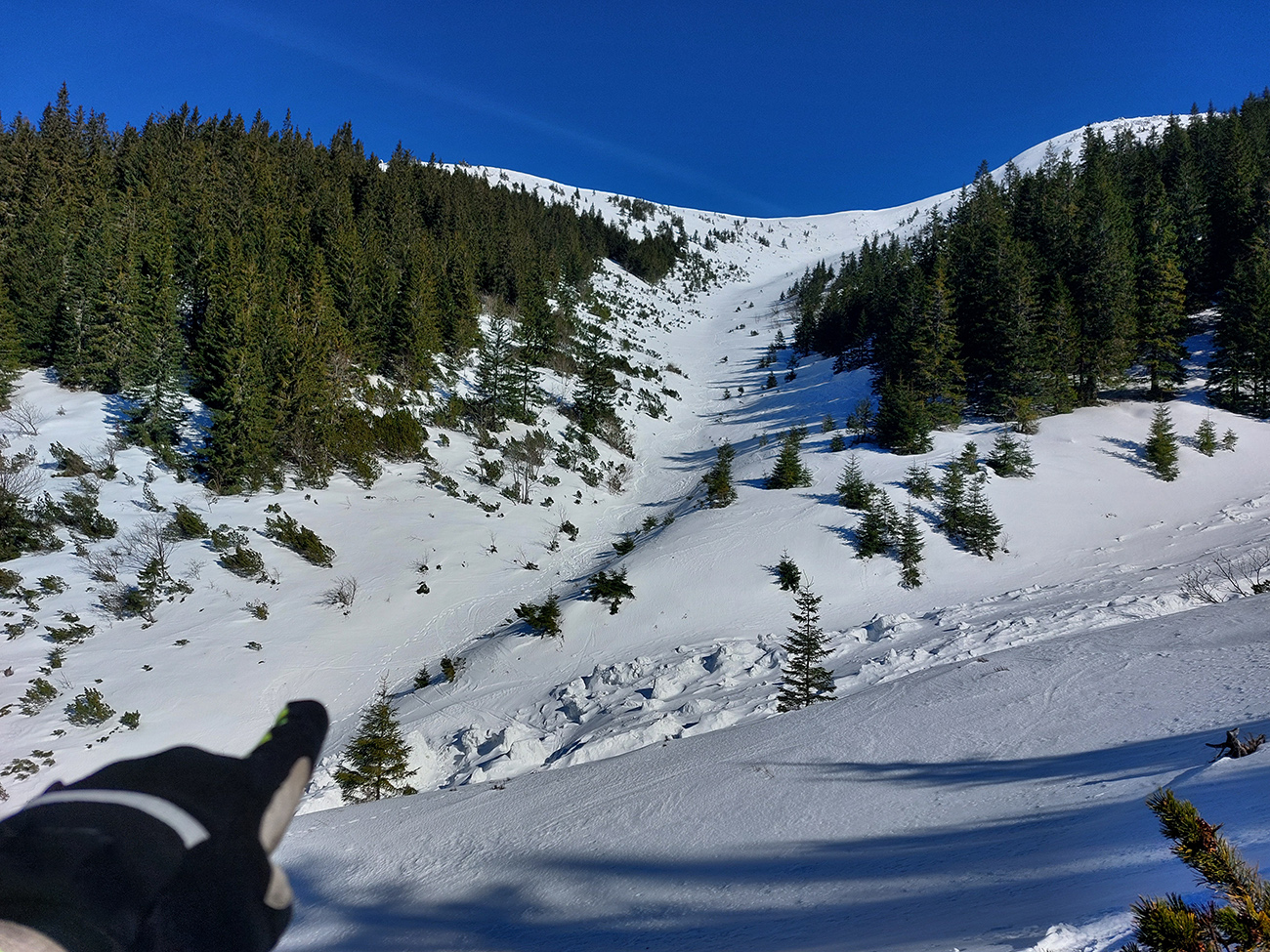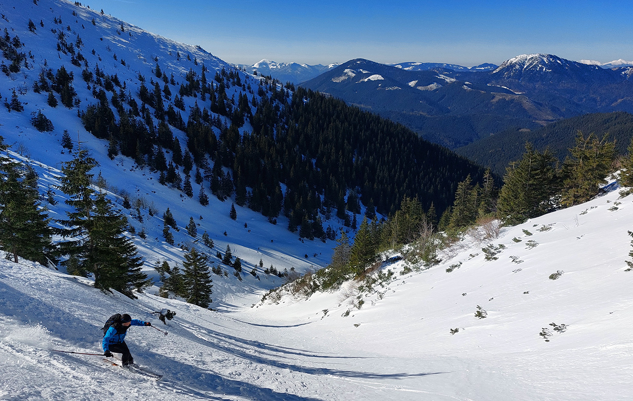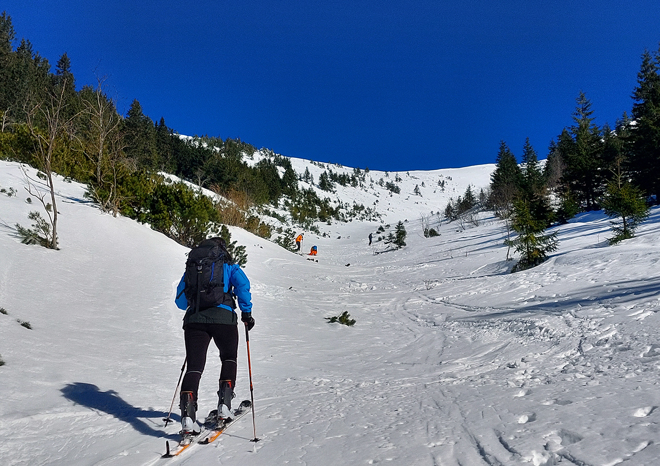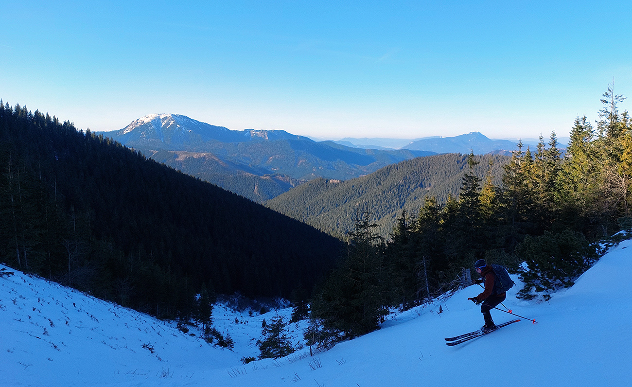 Ako sa to otvorilo, už sme si mohli vyberať, ktorou muldou na hrebeň. Vrhli sme sa najviac doľava, čiže do najširšej, najviac nasvietenej – aj keď len vo vrchnej časti. Čo najbližšie k Ďurkovej, aj keď reálne to najbližšie samozrejme nebolo. Ale nižšie v tieňoch zmrznutý sneh ako šmirgeľ, fasa držal, dalo sa aj v strmom pekne direkt po spádnici. A mimo stopy aj lepšie, lebo tá bola niekde až na ľad vyleštená. Potom vyššie, v strmých cikcakoch na slnku už to bolo trošku povolené. Spätné výhľady samozrejme maestro grandiózo.