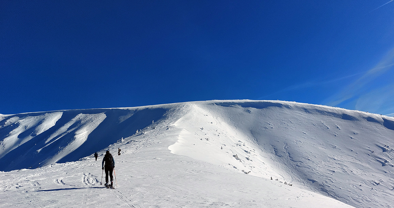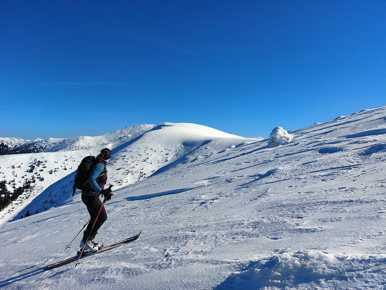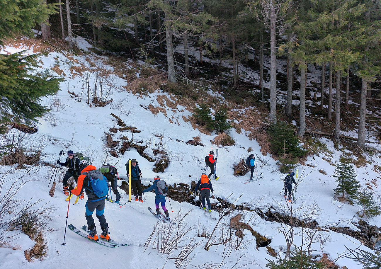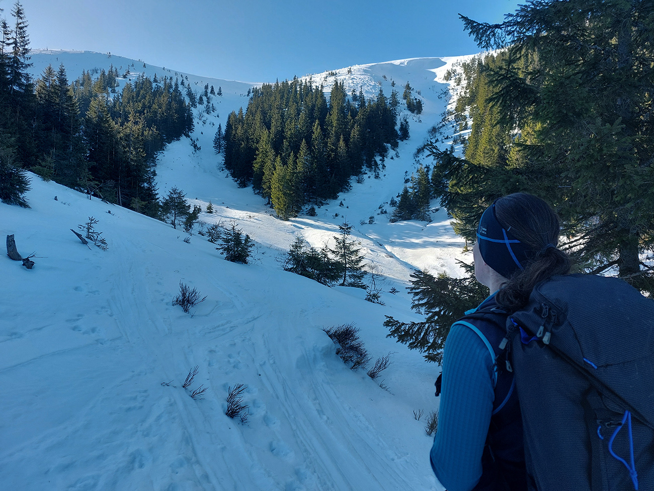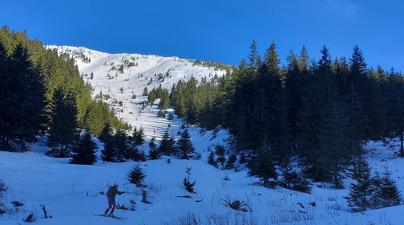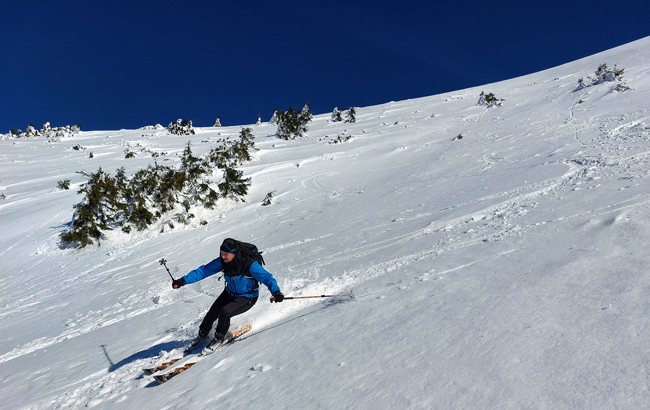Ako sa to otvorilo, už sme si mohli vyberať, ktorou muldou na hrebeň. Vrhli sme sa najviac doľava, čiže do najširšej, najviac nasvietenej – aj keď len vo vrchnej časti. Čo najbližšie k Ďurkovej, aj keď reálne to najbližšie samozrejme nebolo. Ale nižšie v tieňoch zmrznutý sneh ako šmirgeľ, fasa držal, dalo sa aj v strmom pekne direkt po spádnici. A mimo stopy aj lepšie, lebo tá bola niekde až na ľad vyleštená. Potom vyššie, v strmých cikcakoch na slnku už to bolo trošku povolené. Spätné výhľady samozrejme maestro grandiózo.