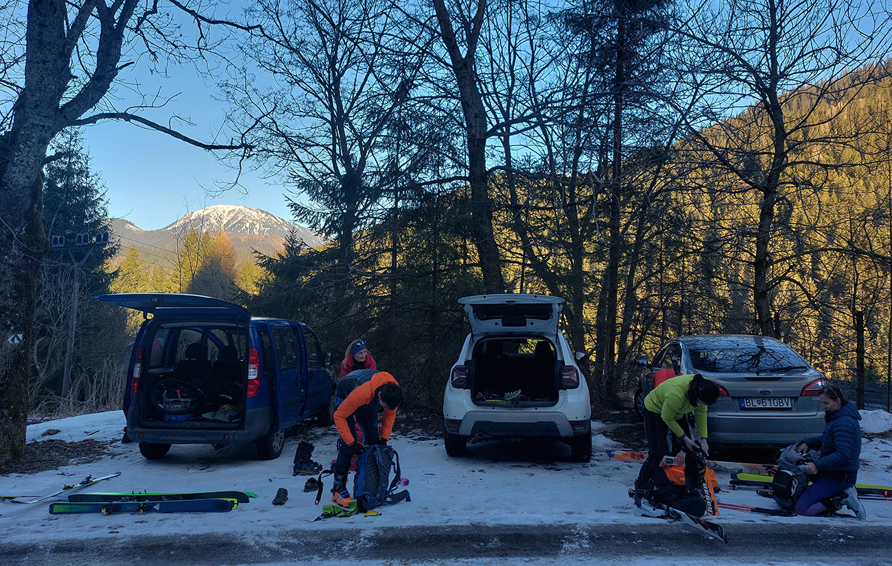 Dole na „križovatke“ sme sa pozliezali, poslušne sa zoradili do vláčika a hybáj hrany brúsiť - bokom, sklzom, pluhom. Najprv úzkou serpentínou k potoku, potom širšími „húpačkami“ popri potoku. Vyzuli sme, kde sme ráno obúvali, takže ozaj takmer kártukár – ani 600 m sme neniesli, lepšie ako teraz v Žiarskej. Ale dlho to také nebude, ak také teplo bude. Treba ísť!