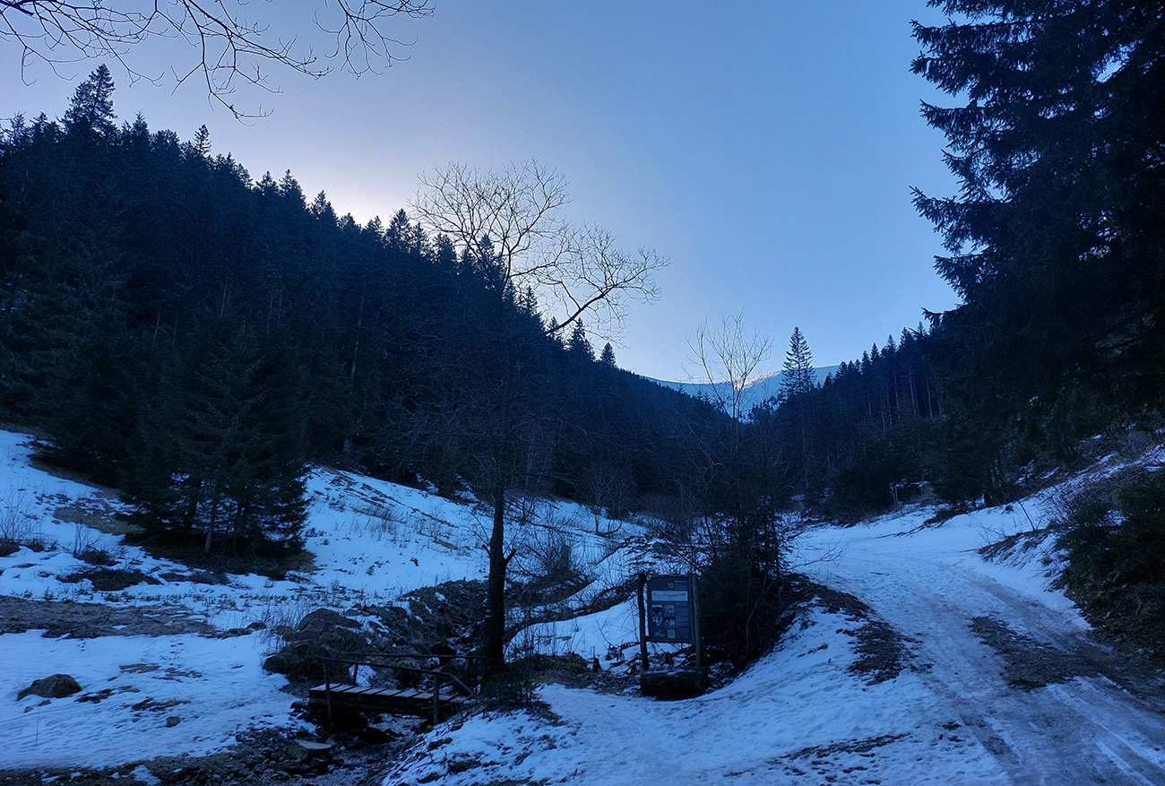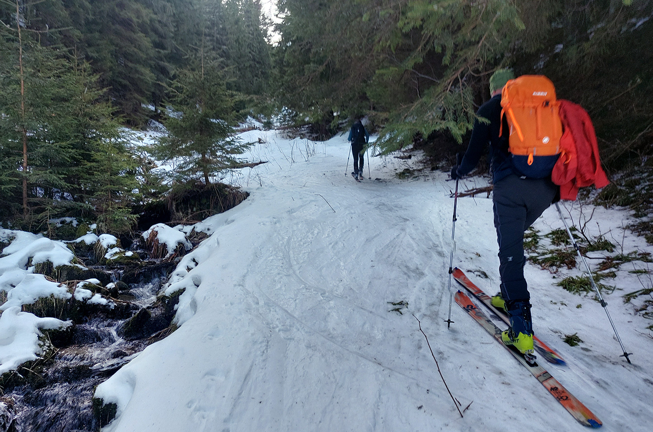 Krásna „jarná“ sobota, posledný deň februára. V kotlinách a dolinách ráno primrznutô a snehu už dávno „nula celá nič“, to isté v tej hlbokej cestou z Partizánskej Ľupče na Magurku. Len medzi chalupami na Magurke trošku ľadu, ale dalo sa v pohode. Na kopcoch nad Litovskou Lúžnou už nad nulou a obloha čistomodrá. Okolo ôsmej sme parkovali v pohode kúsok pod chatou Magurka, vyniesli lyže na chrbtoch kúsok nad odbočku zelenej značky v spodnej časti Viedenky a už sme pásovali proti prúdu potoka: po vyšmýkanom, zatiaľ zamrznutom, šírkovo aj na zjazdenie dostatočnom. No pri tých teplotách a masách ľudí, čo sa tadeto každé popoludnie dole šmýkajú, už to tam dlho nevydrží. Občas kamienky trčali. Vyššie brod cez potok a doľava, do serpentíny lesom - tam už to bolo snehovo oveľa pozitívnešie.