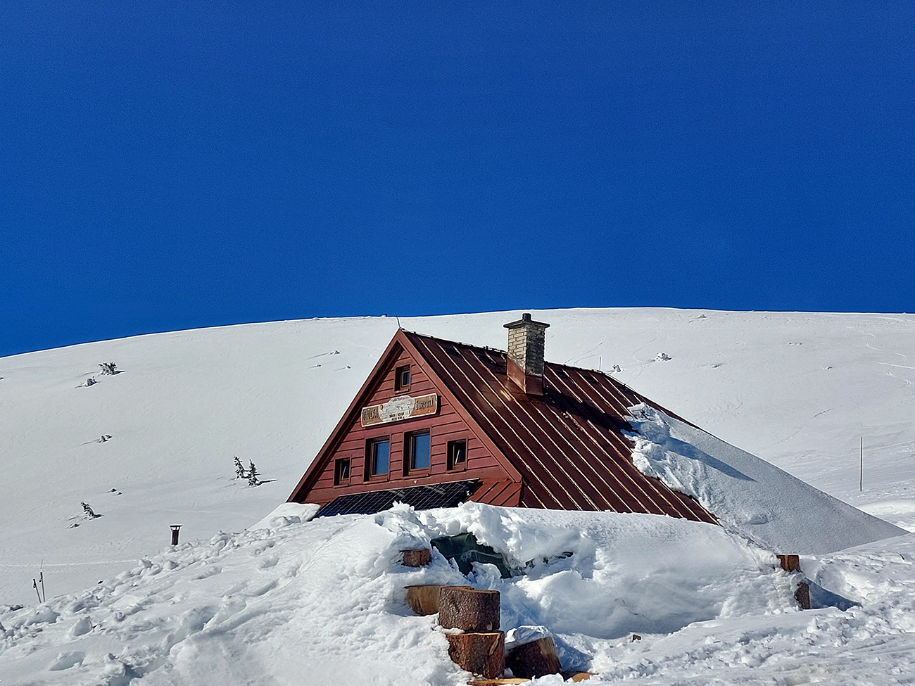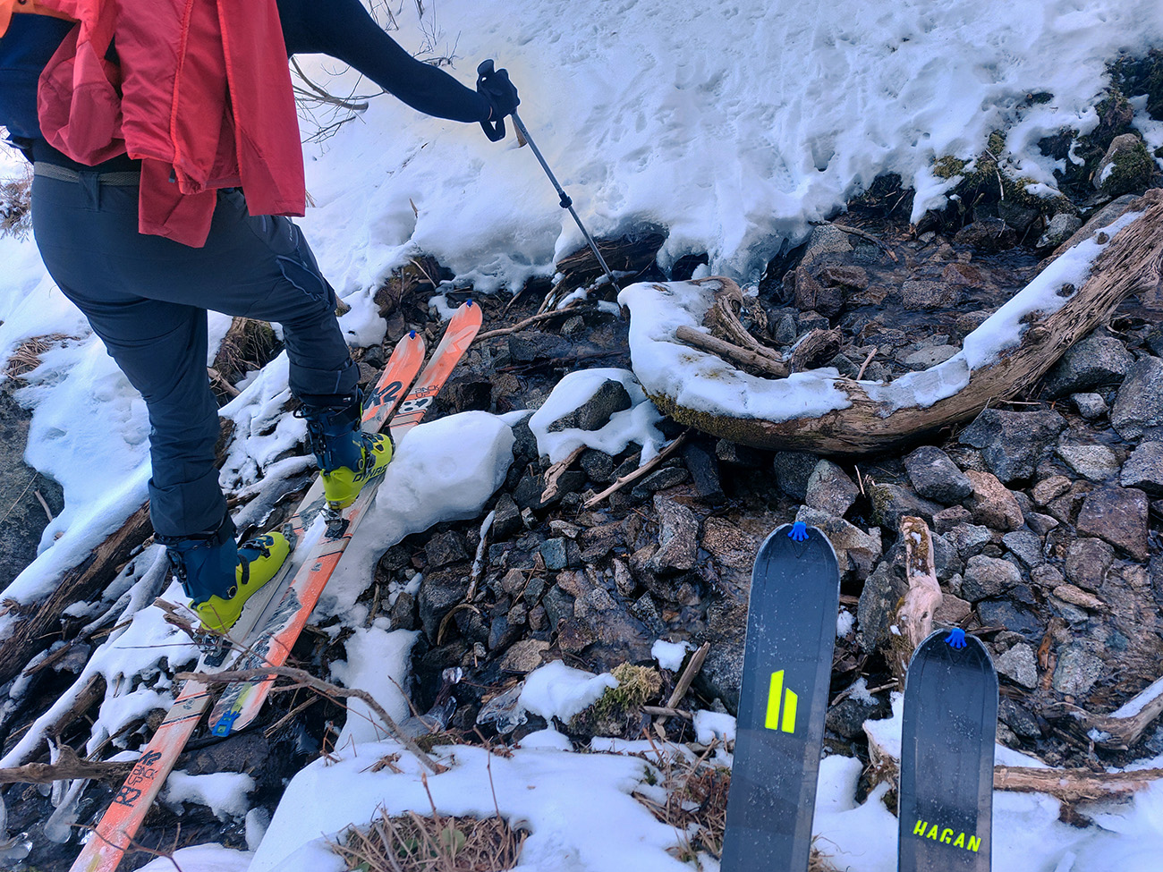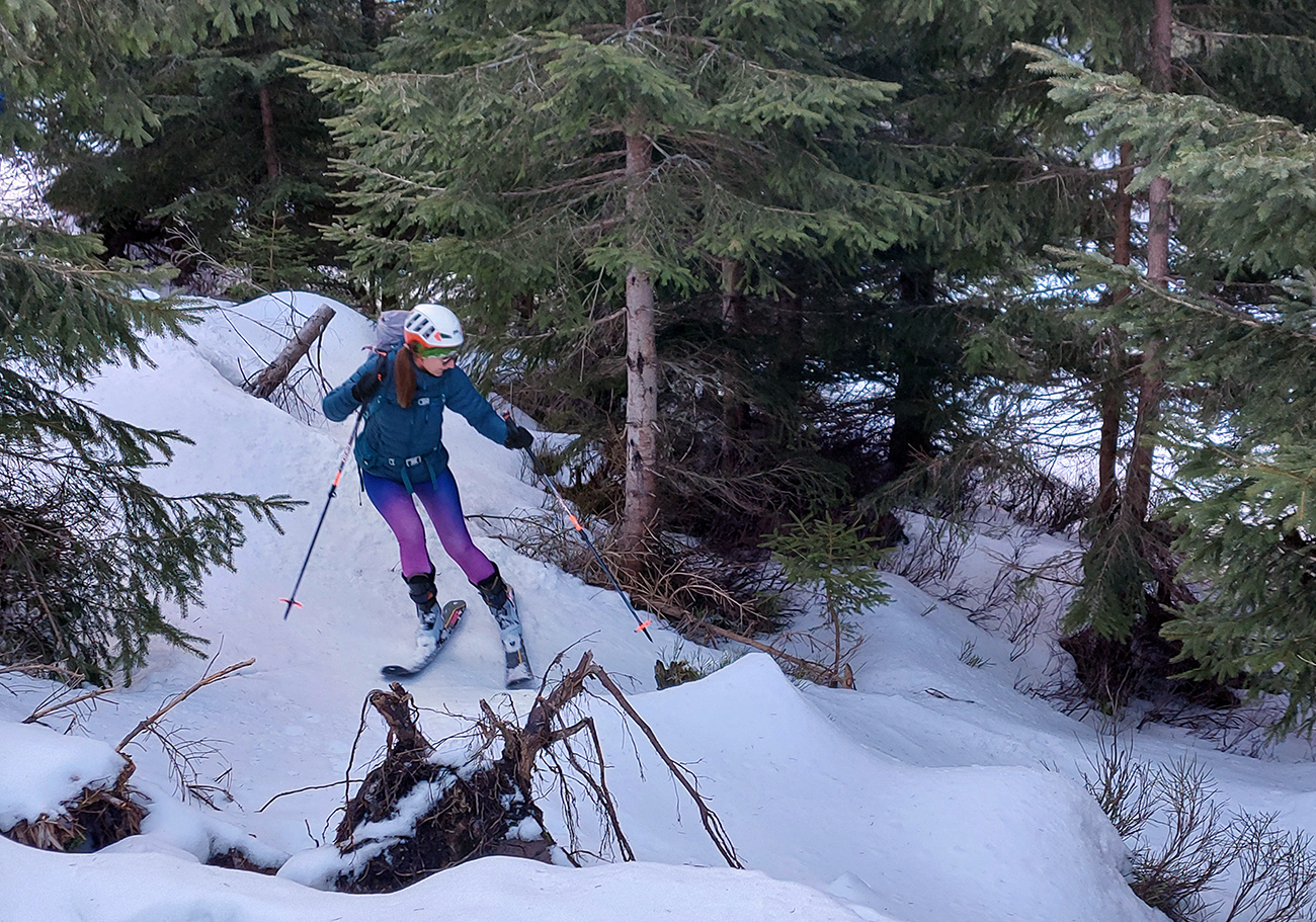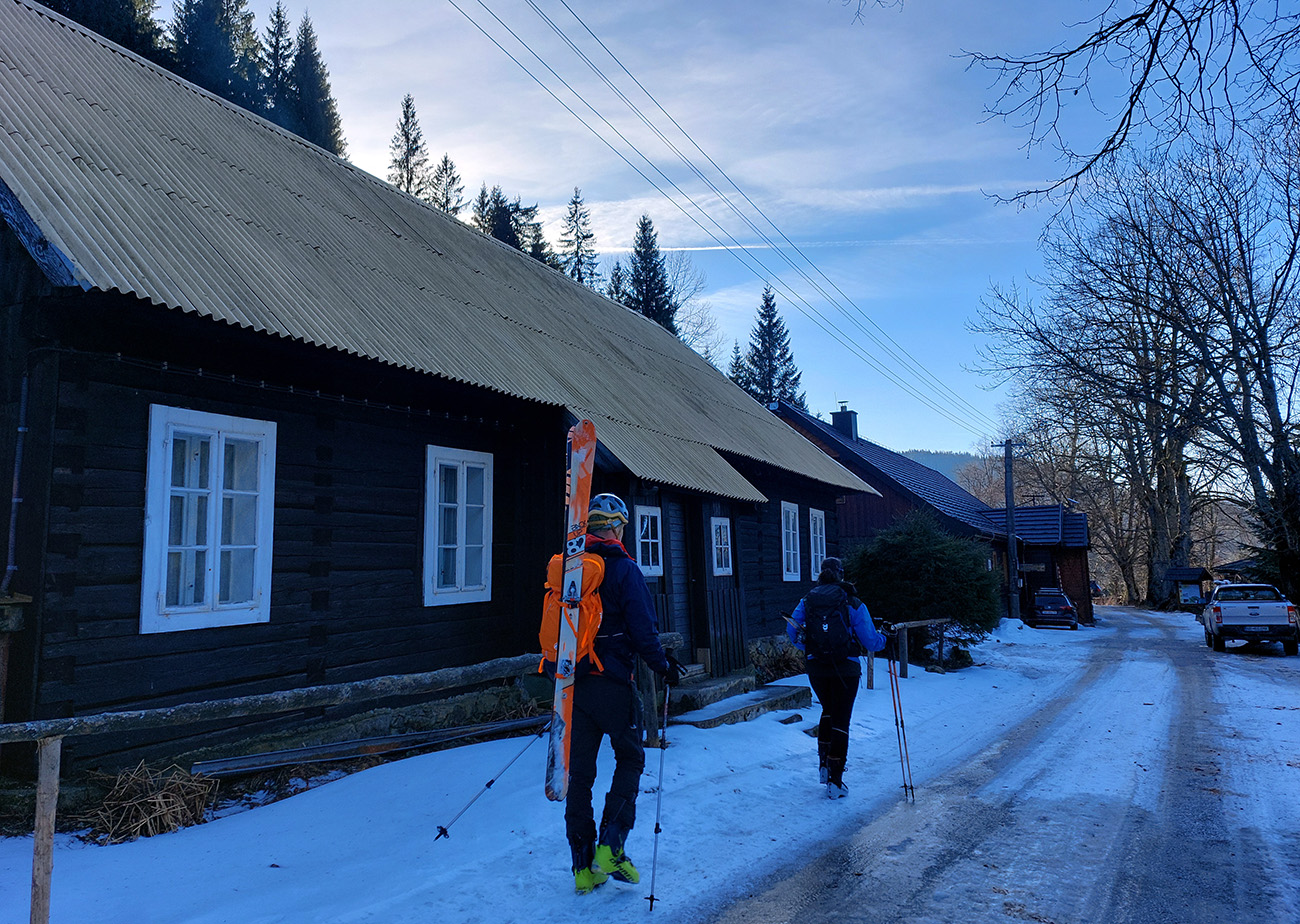 Po bočnom rebre a v nižšom sklone sme sa potom už svižnejšie vykľučkovali pomedzi kosodrevinovo-snehové hrče na Ďurkovú a išlo sa prvý raz lyžovať – popri útulni dole, že kam až snehy pustia. Pustili dákych 200 výškových: hore parádna lyžba na čerstvo odmäknutej tenkej vrstvičke, smerom dole stále hlbšie prebáranie do čoraz prehnitejšej riediny.
