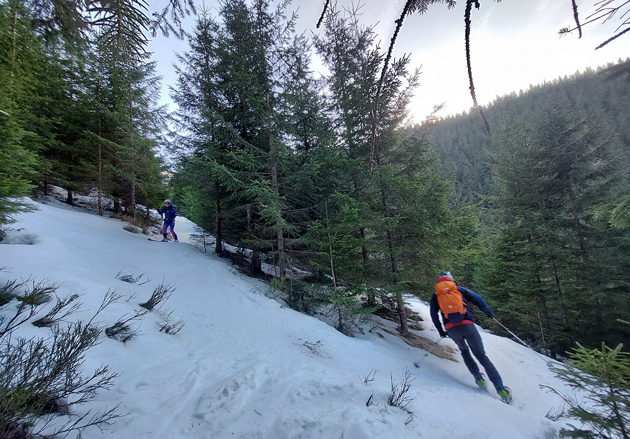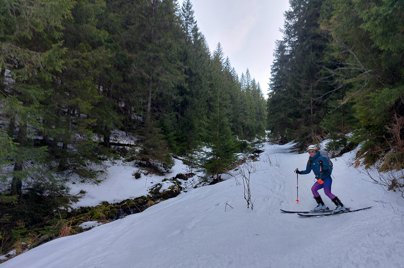Až dole, zase v tieňoch, niekde nad čelom tej lavíny, medzi kríkmi, bola výborná lyžovačka po rovnom a tvrdom. Len krátka no... Tak sme z vyššia poobzerali potenciálny odjazd spodkom žľabu k zelenej značke, ale nezdalo sa to byť komfortnejšie ako v susednej Viedenke. Preto otočka doprava a tým najvýchodnejším žľabom (Korytom) sme sa vydriapali na bočné rebro, na zelenú značku vedúcu z Magurky na hrebeň. V spodnej časti aj tu državý šmirgeľ, hore príjemné, natopené cikcaky, na rebre suchý sneh už lepil na vlhké pásy papuče.