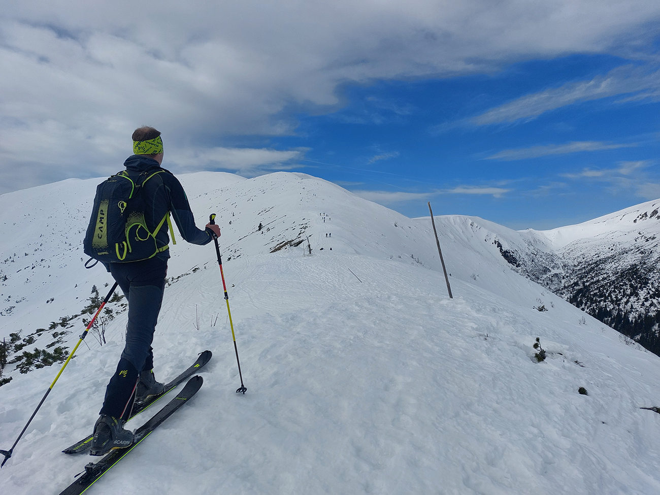 Zároveň sa ale otvárajú výhľady a počasie hovorí, že „východný centrál“ Besnej si asi necháme na koniec, tam teraz ešte zima bude, a teda hrkotavo. Ako prvý skúsime hrebienok z vrcholu na juhovýchod. A opláca sa! Hore trochu prituhnutý, nižšie už odmäknutý firn, ale rovný, také oblúky sa dajú rezať, že až!