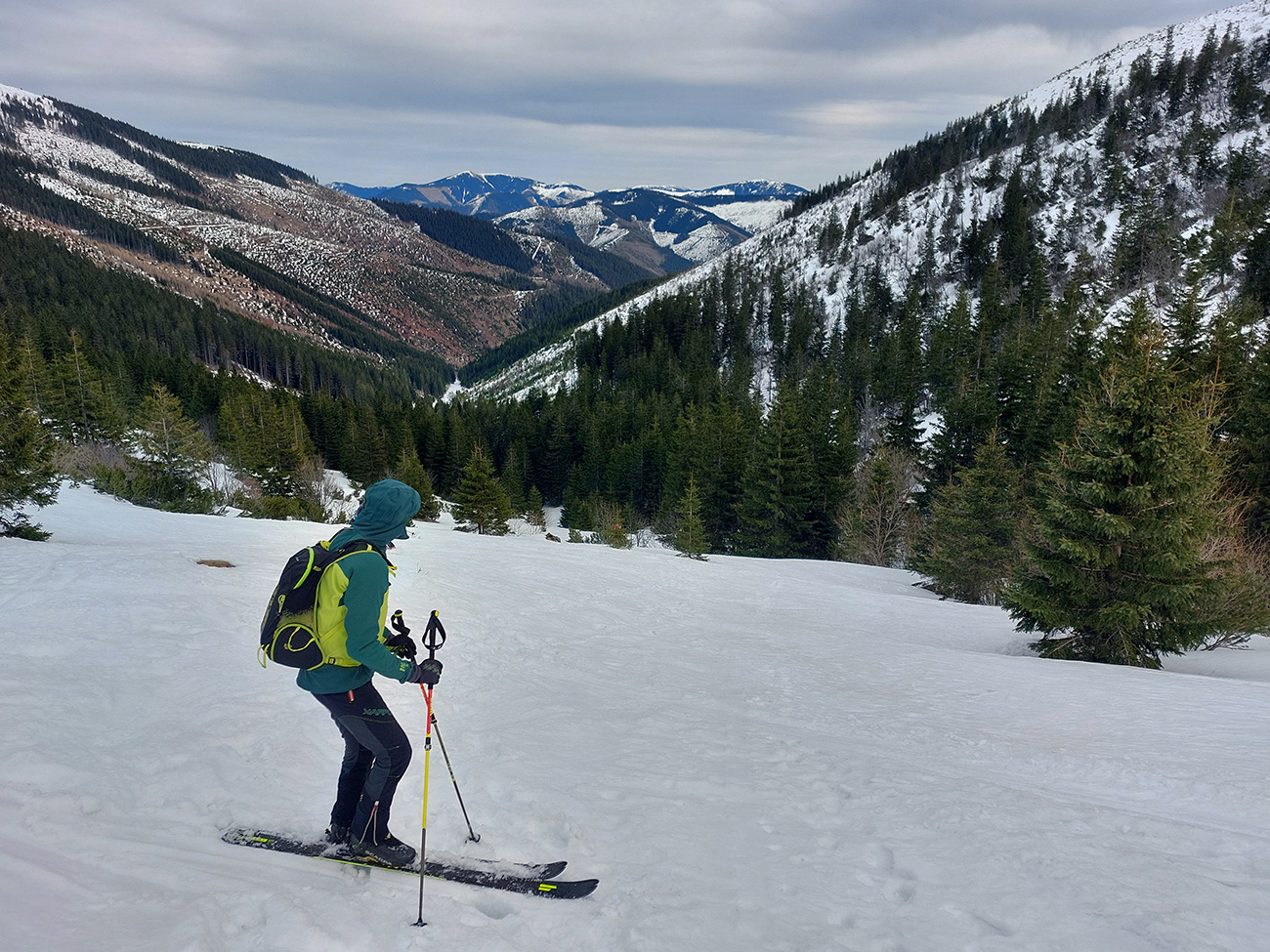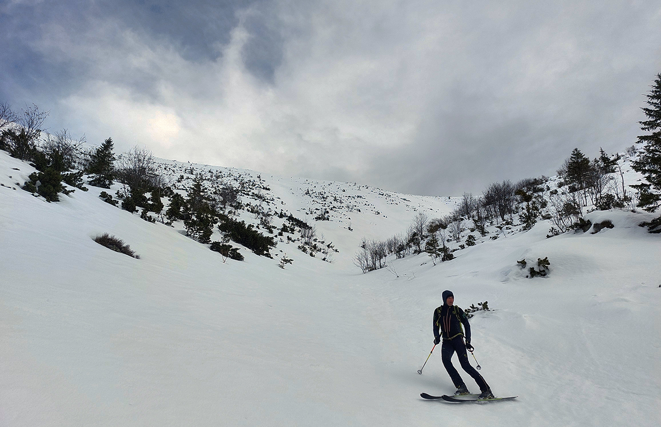 Nazad hore a hneď spomedzi vrcholov sa spúšťame na druhú stranu, na západ. Tentokrát muldou priamo do Pošovej Mlynnej. Tvrdá je, ale nie ľadová, len čím nižšie, tým na kratšie oblúky. Zastavuje nás zúženie a poprepadané diery do potoka. Meter snehu naviac a dalo by sa zísť podstatne nižšie. Pri naliepaní obzeráme hlboké a zablatené stopy „domáceho pána“ pri potoku, potom strmo stúpame vedľajšou muldou, priamo na Králičku.