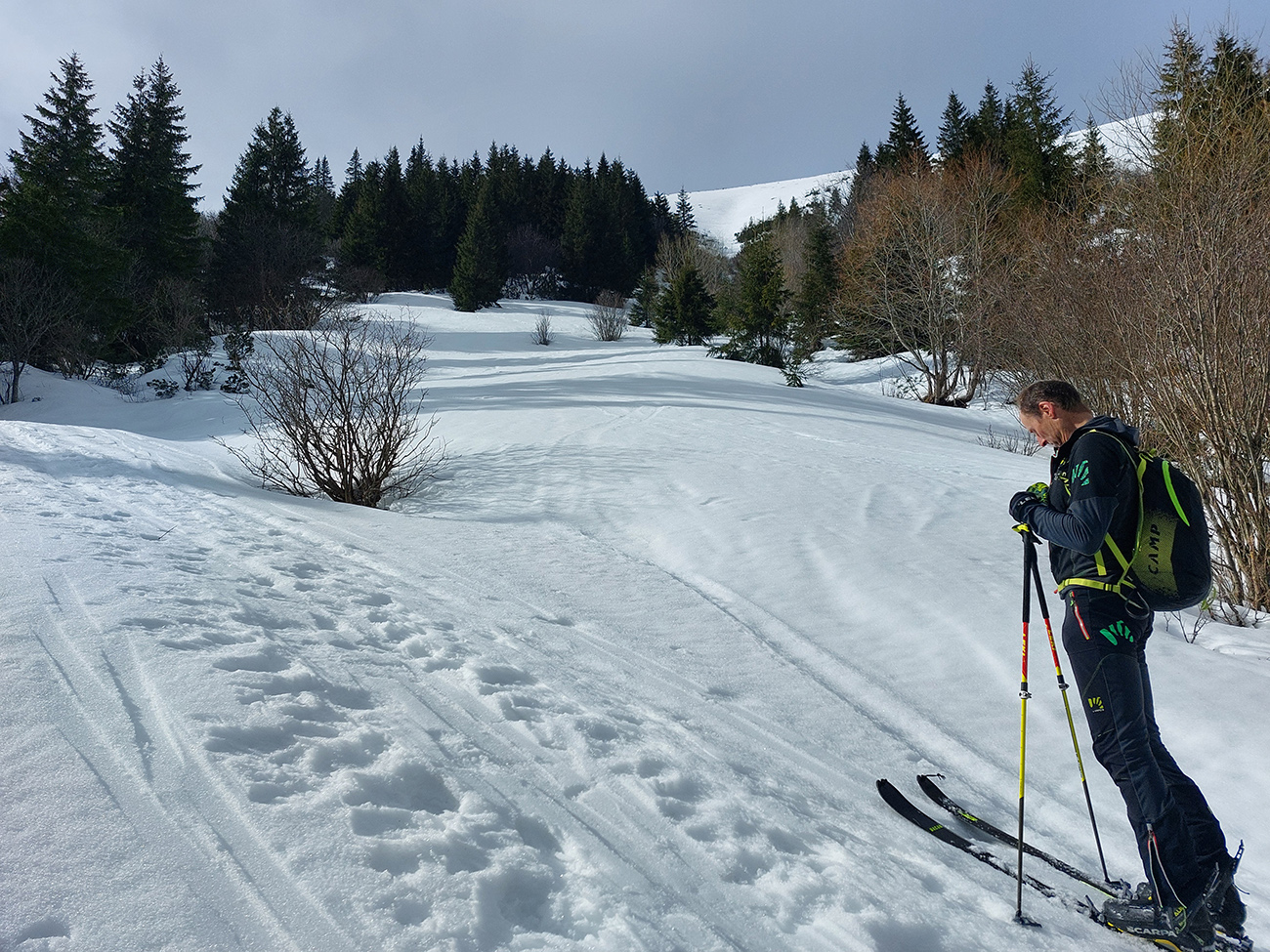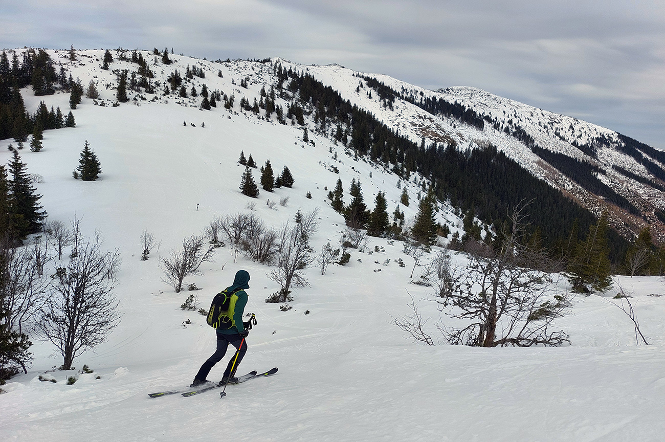 Lebo namiesto návratu traverzom to púšťame do Bocianskeho sedla rovno dole z hrebeňa. Po suchom a tvrdom, krátkymi oblúkmi pomedzi ledva zasnežené vrcholce kosovky. Voľnejšia oblúkovačka z Bocianskeho sedla dole lúkami k lesíku je potom zas o niečom úplne inom, to je pravá jarná firnovačka. Na parádu.