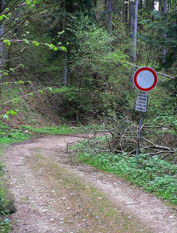 Z dediny daváj popred družstvo, pri bytovke doprava do dlhého traverzu lesom, ktorý ma vyviedol nad Ponickú Lehôtku. Že som z dediny dobre odbočil, naznačila značka „zákaz vjazdu“ :-) Príjemná lesná cesta, len miestami trochu poznačená ťažbou najnovšej kalamity. Na záver prudší krátky zjazd von z lesa na krásne lúky Ponického krasu - z rozkvitnutých čerešní a trniek snežilo, ostatné stromy mali každý iný odtieň zelenej, a tá vôňa dookola!